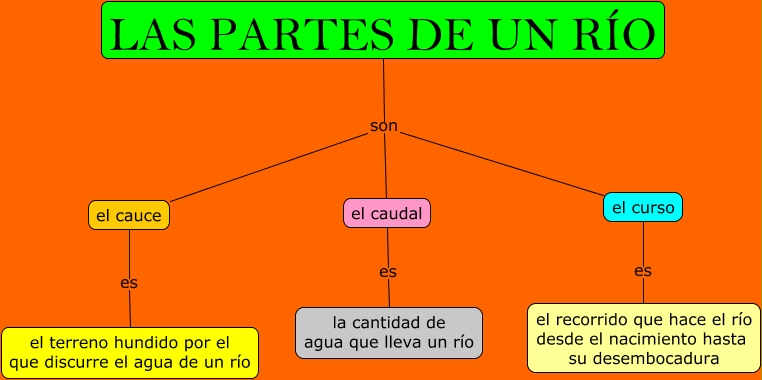 Este Cmap, tiene información relacionada con: Las partes de un río, el curso es el recorrido que hace el río desde el nacimiento hasta su desembocadura, el caudal es la cantidad de agua que lleva un río, LAS PARTES DE UN RÍO son el curso, LAS PARTES DE UN RÍO son el cauce, LAS PARTES DE UN RÍO son el caudal, el cauce es el terreno hundido por el que discurre el agua de un río