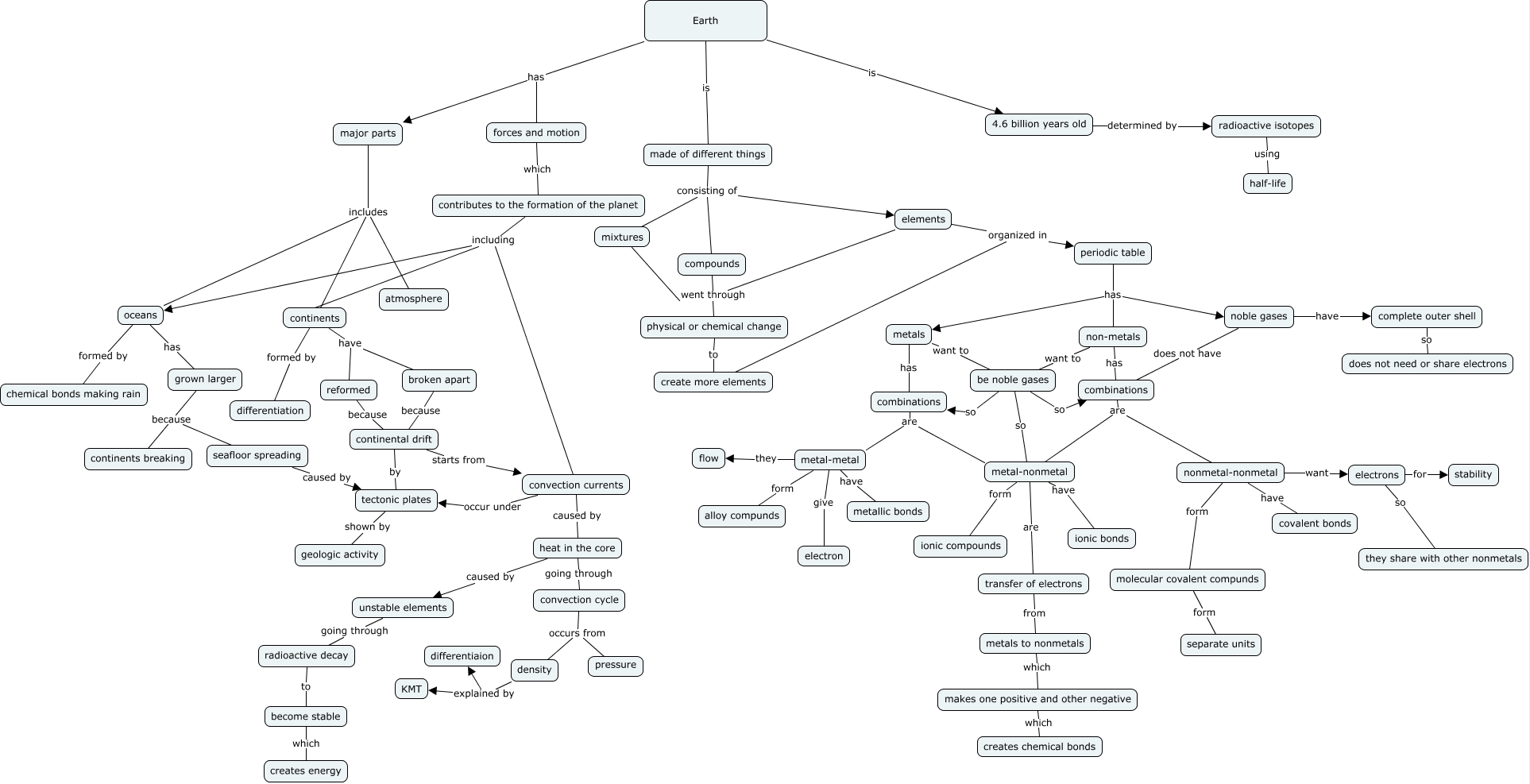 This Concept Map, created with IHMC CmapTools, has information related to: Extra Credit CMAP, made of different things consisting of mixtures, combinations are metal-nonmetal, tectonic plates shown by geologic activity, broken apart because continental drift, nonmetal-nonmetal want electrons, Earth is 4.6 billion years old, reformed because continental drift, periodic table has noble gases, contributes to the formation of the planet including continents, metals to nonmetals which makes one positive and other negative, metal-metal have metallic bonds, molecular covalent compunds form separate units, physical or chemical change to create more elements, density explained by KMT, contributes to the formation of the planet including convection currents, radioactive decay to become stable, contributes to the formation of the planet including oceans, oceans formed by chemical bonds making rain, metal-nonmetal have ionic bonds, makes one positive and other negative which creates chemical bonds