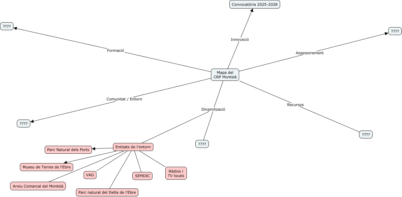 Aquest mapa conceptual conté informació relacionada amb: Mapa CRP, Entitats de l'entorn Museu de Terres de l'Ebre, Mapa del CRP Montsià Innovació Convocatòria 2025-2028, Entitats de l'entorn SEMDIC, Mapa del CRP Montsià Recursos ????, Mapa del CRP Montsià Dinamització ????, Mapa del CRP Montsià Dinamització Entitats de l'entorn, Entitats de l'entorn VAG, Mapa del CRP Montsià Assessorament ????, Mapa del CRP Montsià Comunitat / Entorn ????, Entitats de l'entorn Ràdios i TV locals, Entitats de l'entorn Parc natural del Delta de l'Ebre, Entitats de l'entorn Parc Natural dels Ports, Mapa del CRP Montsià Formació ????, Entitats de l'entorn Arxiu Comarcal del Montsià