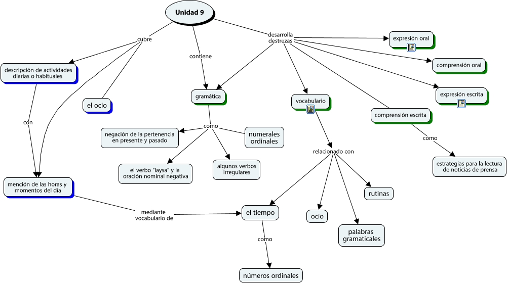 Este Cmap, tiene información relacionada con: Kitab unidad 9, Unidad 9 desarrolla destrezas vocabulario, Unidad 9 desarrolla destrezas gramática, Unidad 9 cubre el ocio, Unidad 9 desarrolla destrezas expresión escrita, vocabulario relacionado con ocio, gramática como numerales ordinales, vocabulario relacionado con palabras gramaticales, Unidad 9 cubre mención de las horas y momentos del día, gramática como algunos verbos irregulares, mención de las horas y momentos del día mediante vocabulario de el tiempo, gramática como negación de la pertenencia en presente y pasado, Unidad 9 desarrolla destrezas comprensión oral, Unidad 9 desarrolla destrezas comprensión escrita, gramática como el verbo "laysa" y la oración nominal negativa, descripción de actividades diarias o habituales con mención de las horas y momentos del día, vocabulario relacionado con el tiempo, comprensión escrita como estrategias para la lectura de noticias de prensa, el tiempo como números ordinales, Unidad 9 cubre descripción de actividades diarias o habituales, Unidad 9 desarrolla destrezas expresión oral