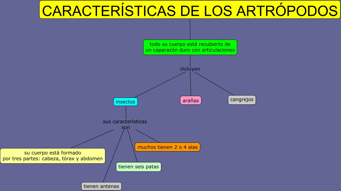 Este Cmap, tiene información relacionada con: Características de los artrópodos, todo su cuerpo está recubierto de un caparazón duro con articulaciones incluyen insectos, insectos sus características son muchos tienen 2 o 4 alas, todo su cuerpo está recubierto de un caparazón duro con articulaciones incluyen arañas, todo su cuerpo está recubierto de un caparazón duro con articulaciones incluyen cangrejos, insectos sus características son su cuerpo está formado por tres partes: cabeza, tórax y abdomen, insectos sus características son tienen antenas, CARACTERÍSTICAS DE LOS ARTRÓPODOS todo su cuerpo está recubierto de un caparazón duro con articulaciones, insectos sus características son tienen seis patas