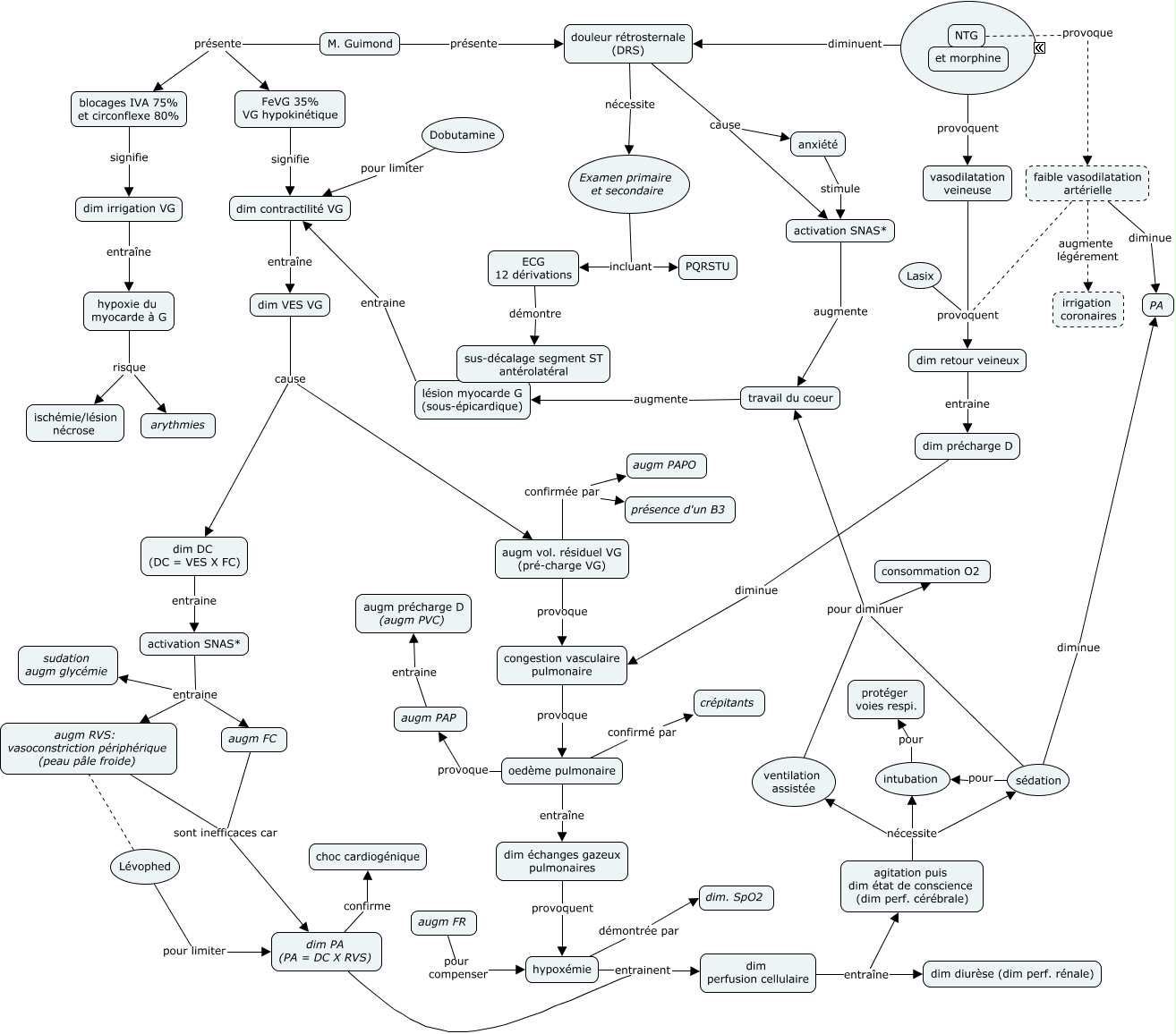 Cette carte de concepts créée avec IHMC CmapTools traite de: SIC M. Guimond 2 H18, dim PA (PA = DC X RVS) entrainent dim perfusion cellulaire, dim échanges gazeux pulmonaires provoquent hypoxémie, faible vasodilatation artérielle diminue PA, dim retour veineux entraine dim précharge D, augm RVS: vasoconstriction périphérique (peau pâle froide) sont inefficaces car dim PA (PA = DC X RVS), augm FR pour compenser hypoxémie, agitation puis dim état de conscience (dim perf. cérébrale) nécessite ventilation assistée, dim PA (PA = DC X RVS) confirme choc cardiogénique, FeVG 35% VG hypokinétique signifie dim contractilité VG, ECG 12 dérivations démontre sus-décalage segment ST antérolatéral, sédation pour intubation, Lasix provoquent dim retour veineux, faible vasodilatation artérielle augmente légérement irrigation coronaires, hypoxémie démontrée par dim. SpO2, hypoxie du myocarde à G risque arythmies, ventilation assistée pour diminuer consommation O2, augm vol. résiduel VG (pré-charge VG) provoque congestion vasculaire pulmonaire, ventilation assistée pour diminuer travail du coeur, activation SNAS* entraine augm FC, blocages IVA 75% et circonflexe 80% signifie dim irrigation VG