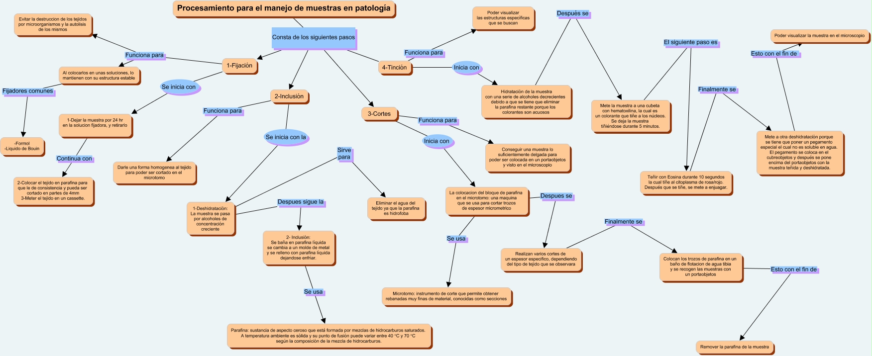 Este Cmap, tiene información relacionada con: Armando Viramontes Meta1.1, 1-Fijación Funciona para Al colocarlos en unas soluciones, lo mantienen con su estructura estable, Procesamiento para el manejo de muestras en patología Consta de los siguientes pasos 2-Inclusión, Mete a otra deshidratación porque se tiene que poner un pegamento especial el cual no es soluble en agua. El pegamento se coloca en el cubreobjetos y después se pone encima del portaobjetos con la muestra teñida y deshidratada. Esto con el fin de Poder visualizar la muestra en el microscopio, 1-Deshidratación: La muestra se pasa por alcoholes de concentración creciente Sirve para Eliminar el agua del tejido ya que la parafina es hidrofoba, 1-Deshidratación: La muestra se pasa por alcoholes de concentración creciente Despues sigue la 2- Inclusión: Se baña en parafina líquida se cambia a un molde de metal y se relleno con parafina líquida dejandose enfríar., La colocacion del bloque de parafina en el microtomo: una maquina que se usa para cortar trozos de espesor micrometrico Se usa Microtomo: instrumento de corte que permite obtener rebanadas muy finas de material, conocidas como secciones, Colocan los trozos de parafina en un baño de flotacion de agua tibia y se recogen las muestras con un portaobjetos Esto con el fin de Remover la parafina de la muestra, 2-Inclusión Se inicia con la 1-Deshidratación: La muestra se pasa por alcoholes de concentración creciente, Procesamiento para el manejo de muestras en patología Consta de los siguientes pasos 1-Fijación, 2- Inclusión: Se baña en parafina líquida se cambia a un molde de metal y se relleno con parafina líquida dejandose enfríar. Se usa Parafina: sustancia de aspecto ceroso que está formada por mezclas de hidrocarburos saturados. A temperatura ambiente es sólida y su punto de fusión puede variar entre 40 °C y 70 °C según la composición de la mezcla de hidrocarburos., Procesamiento para el manejo de muestras en patología Consta de los siguientes pasos 3-Cortes, Teñir con Eosina durante 10 segundos la cual tiñe al citoplasma de rosa/rojo. Después que se tiñe, se mete a enjuagar. Finalmente se Mete a otra deshidratación porque se tiene que poner un pegamento especial el cual no es soluble en agua. El pegamento se coloca en el cubreobjetos y después se pone encima del portaobjetos con la muestra teñida y deshidratada., 4-Tinción Inicia con Hidratación de la muestra con una serie de alcoholes decrecientes debido a que se tiene que eliminar la parafina restante porque los colorantes son acuosos, Al colocarlos en unas soluciones, lo mantienen con su estructura estable Fijadores comunes -Formol -Liquido de Bouin, 1-Fijación Se inicia con 1-Dejar la muestra por 24 hr en la solucion fijadora, y retirarlo, Realizan varios cortes de un espesor especifico, dependiendo del tipo de tejido que se observara Finalmente se Colocan los trozos de parafina en un baño de flotacion de agua tibia y se recogen las muestras con un portaobjetos, 2-Inclusión Funciona para Darle una forma homogenea al tejido para poder ser cortado en el microtomo, 3-Cortes Funciona para Conseguir una muestra lo suficientemente delgada para poder ser colocada en un portaobjetos y visto en el microscopio, 1-Dejar la muestra por 24 hr en la solucion fijadora, y retirarlo Continua con 2-Colocar el tejido en parafina para que le de consistencia y pueda ser cortado en partes de 4mm 3-Meter el tejido en un cassette., 4-Tinción Funciona para Poder visualizar las estructuras específicas que se buscan