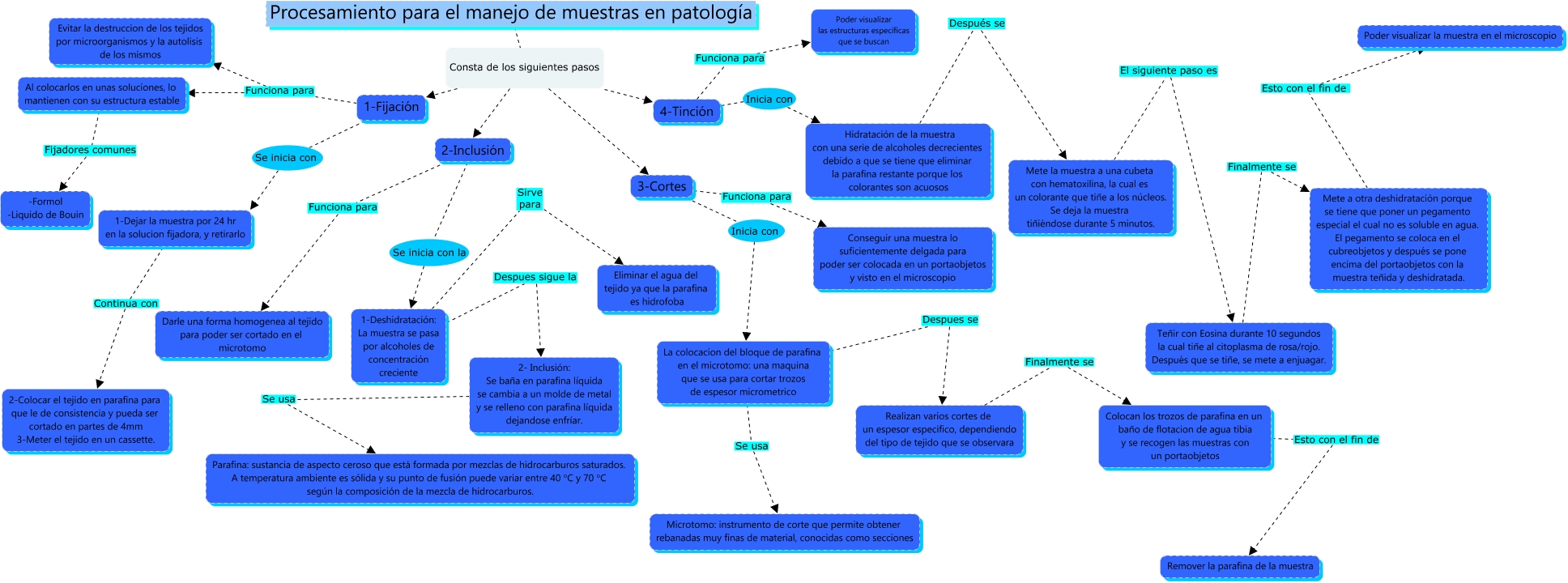 Este Cmap, tiene información relacionada con: Angel, 1-Fijación Funciona para Al colocarlos en unas soluciones, lo mantienen con su estructura estable, Procesamiento para el manejo de muestras en patología Consta de los siguientes pasos 2-Inclusión, Mete a otra deshidratación porque se tiene que poner un pegamento especial el cual no es soluble en agua. El pegamento se coloca en el cubreobjetos y después se pone encima del portaobjetos con la muestra teñida y deshidratada. Esto con el fin de Poder visualizar la muestra en el microscopio, 1-Deshidratación: La muestra se pasa por alcoholes de concentración creciente Sirve para Eliminar el agua del tejido ya que la parafina es hidrofoba, 1-Deshidratación: La muestra se pasa por alcoholes de concentración creciente Despues sigue la 2- Inclusión: Se baña en parafina líquida se cambia a un molde de metal y se relleno con parafina líquida dejandose enfríar., La colocacion del bloque de parafina en el microtomo: una maquina que se usa para cortar trozos de espesor micrometrico Se usa Microtomo: instrumento de corte que permite obtener rebanadas muy finas de material, conocidas como secciones, Colocan los trozos de parafina en un baño de flotacion de agua tibia y se recogen las muestras con un portaobjetos Esto con el fin de Remover la parafina de la muestra, 2-Inclusión Se inicia con la 1-Deshidratación: La muestra se pasa por alcoholes de concentración creciente, Procesamiento para el manejo de muestras en patología Consta de los siguientes pasos 1-Fijación, 2- Inclusión: Se baña en parafina líquida se cambia a un molde de metal y se relleno con parafina líquida dejandose enfríar. Se usa Parafina: sustancia de aspecto ceroso que está formada por mezclas de hidrocarburos saturados. A temperatura ambiente es sólida y su punto de fusión puede variar entre 40 °C y 70 °C según la composición de la mezcla de hidrocarburos., Procesamiento para el manejo de muestras en patología Consta de los siguientes pasos 3-Cortes, Teñir con Eosina durante 10 segundos la cual tiñe al citoplasma de rosa/rojo. Después que se tiñe, se mete a enjuagar. Finalmente se Mete a otra deshidratación porque se tiene que poner un pegamento especial el cual no es soluble en agua. El pegamento se coloca en el cubreobjetos y después se pone encima del portaobjetos con la muestra teñida y deshidratada., 4-Tinción Inicia con Hidratación de la muestra con una serie de alcoholes decrecientes debido a que se tiene que eliminar la parafina restante porque los colorantes son acuosos, Al colocarlos en unas soluciones, lo mantienen con su estructura estable Fijadores comunes -Formol -Liquido de Bouin, 1-Fijación Se inicia con 1-Dejar la muestra por 24 hr en la solucion fijadora, y retirarlo, Realizan varios cortes de un espesor especifico, dependiendo del tipo de tejido que se observara Finalmente se Colocan los trozos de parafina en un baño de flotacion de agua tibia y se recogen las muestras con un portaobjetos, 2-Inclusión Funciona para Darle una forma homogenea al tejido para poder ser cortado en el microtomo, 3-Cortes Funciona para Conseguir una muestra lo suficientemente delgada para poder ser colocada en un portaobjetos y visto en el microscopio, 1-Dejar la muestra por 24 hr en la solucion fijadora, y retirarlo Continua con 2-Colocar el tejido en parafina para que le de consistencia y pueda ser cortado en partes de 4mm 3-Meter el tejido en un cassette., 4-Tinción Funciona para Poder visualizar las estructuras específicas que se buscan
