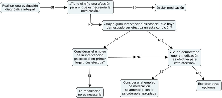 Este Cmap, tiene información relacionada con: Medicacion_niños, ¿Tiene el niño una afección para el que es necesaria la medicación? SI Iniciar medicación, Realizar una evaluación diagnóstica integral SI ¿Tiene el niño una afección para el que es necesaria la medicación?, ¿Se ha demostrado que la medicación es efectiva para esta afección? SI Considerar el empleo de medicación solamente o con la psicoterapia apropiada, ¿Tiene el niño una afección para el que es necesaria la medicación? NO ¿Hay alguna intervención psicosocial que haya demostrado ser efectiva en esta condición?, Considerar el empleo de la intervención psicosocial en primer lugar: ¿es efectiva? NO ¿Se ha demostrado que la medicación es efectiva para esta afección?, ¿Hay alguna intervención psicosocial que haya demostrado ser efectiva en esta condición? NO ¿Se ha demostrado que la medicación es efectiva para esta afección?, Considerar el empleo de la intervención psicosocial en primer lugar: ¿es efectiva? SI La medicación no es necesaria, ¿Hay alguna intervención psicosocial que haya demostrado ser efectiva en esta condición? SI Considerar el empleo de la intervención psicosocial en primer lugar: ¿es efectiva?, ¿Se ha demostrado que la medicación es efectiva para esta afección? NO Explorar otras opciones