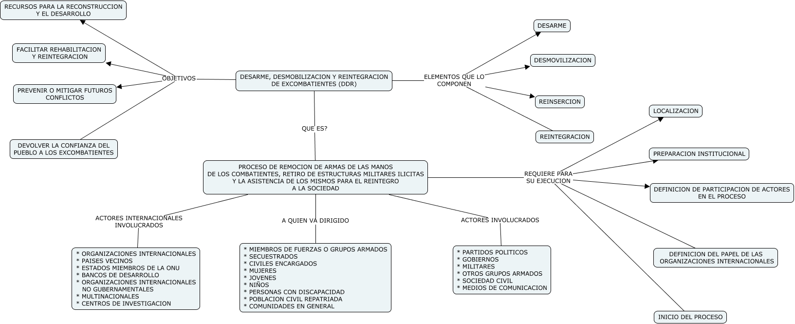 Este Cmap, tiene información relacionada con: Sin Título 1, DESARME, DESMOBILIZACION Y REINTEGRACION DE EXCOMBATIENTES (DDR) ELEMENTOS QUE LO COMPONEN REINSERCION, DESARME, DESMOBILIZACION Y REINTEGRACION DE EXCOMBATIENTES (DDR) OBJETIVOS DEVOLVER LA CONFIANZA DEL PUEBLO A LOS EXCOMBATIENTES, PROCESO DE REMOCION DE ARMAS DE LAS MANOS DE LOS COMBATIENTES, RETIRO DE ESTRUCTURAS MILITARES ILICITAS Y LA ASISTENCIA DE LOS MISMOS PARA EL REINTEGRO A LA SOCIEDAD ACTORES INVOLUCRADOS * PARTIDOS POLITICOS * GOBIERNOS * MILITARES * OTROS GRUPOS ARMADOS * SOCIEDAD CIVIL * MEDIOS DE COMUNICACION, DESARME, DESMOBILIZACION Y REINTEGRACION DE EXCOMBATIENTES (DDR) OBJETIVOS RECURSOS PARA LA RECONSTRUCCION Y EL DESARROLLO, PROCESO DE REMOCION DE ARMAS DE LAS MANOS DE LOS COMBATIENTES, RETIRO DE ESTRUCTURAS MILITARES ILICITAS Y LA ASISTENCIA DE LOS MISMOS PARA EL REINTEGRO A LA SOCIEDAD REQUIERE PARA SU EJECUCION INICIO DEL PROCESO, PROCESO DE REMOCION DE ARMAS DE LAS MANOS DE LOS COMBATIENTES, RETIRO DE ESTRUCTURAS MILITARES ILICITAS Y LA ASISTENCIA DE LOS MISMOS PARA EL REINTEGRO A LA SOCIEDAD REQUIERE PARA SU EJECUCION LOCALIZACION, PROCESO DE REMOCION DE ARMAS DE LAS MANOS DE LOS COMBATIENTES, RETIRO DE ESTRUCTURAS MILITARES ILICITAS Y LA ASISTENCIA DE LOS MISMOS PARA EL REINTEGRO A LA SOCIEDAD REQUIERE PARA SU EJECUCION PREPARACION INSTITUCIONAL, PROCESO DE REMOCION DE ARMAS DE LAS MANOS DE LOS COMBATIENTES, RETIRO DE ESTRUCTURAS MILITARES ILICITAS Y LA ASISTENCIA DE LOS MISMOS PARA EL REINTEGRO A LA SOCIEDAD REQUIERE PARA SU EJECUCION DEFINICION DEL PAPEL DE LAS ORGANIZACIONES INTERNACIONALES, PROCESO DE REMOCION DE ARMAS DE LAS MANOS DE LOS COMBATIENTES, RETIRO DE ESTRUCTURAS MILITARES ILICITAS Y LA ASISTENCIA DE LOS MISMOS PARA EL REINTEGRO A LA SOCIEDAD ACTORES INTERNACIONALES INVOLUCRADOS * ORGANIZACIONES INTERNACIONALES * PAISES VECINOS * ESTADOS MIEMBROS DE LA ONU * BANCOS DE DESARROLLO * ORGANIZACIONES INTERNACIONALES NO GUBERNAMENTALES * MULTINACIONALES * CENTROS DE INVESTIGACION, DESARME, DESMOBILIZACION Y REINTEGRACION DE EXCOMBATIENTES (DDR) ELEMENTOS QUE LO COMPONEN DESMOVILIZACION, PROCESO DE REMOCION DE ARMAS DE LAS MANOS DE LOS COMBATIENTES, RETIRO DE ESTRUCTURAS MILITARES ILICITAS Y LA ASISTENCIA DE LOS MISMOS PARA EL REINTEGRO A LA SOCIEDAD REQUIERE PARA SU EJECUCION DEFINICION DE PARTICIPACION DE ACTORES EN EL PROCESO, DESARME, DESMOBILIZACION Y REINTEGRACION DE EXCOMBATIENTES (DDR) ELEMENTOS QUE LO COMPONEN REINTEGRACION, DESARME, DESMOBILIZACION Y REINTEGRACION DE EXCOMBATIENTES (DDR) QUE ES? PROCESO DE REMOCION DE ARMAS DE LAS MANOS DE LOS COMBATIENTES, RETIRO DE ESTRUCTURAS MILITARES ILICITAS Y LA ASISTENCIA DE LOS MISMOS PARA EL REINTEGRO A LA SOCIEDAD, PROCESO DE REMOCION DE ARMAS DE LAS MANOS DE LOS COMBATIENTES, RETIRO DE ESTRUCTURAS MILITARES ILICITAS Y LA ASISTENCIA DE LOS MISMOS PARA EL REINTEGRO A LA SOCIEDAD A QUIEN VA DIRIGIDO * MIEMBROS DE FUERZAS O GRUPOS ARMADOS * SECUESTRADOS * CIVILES ENCARGADOS * MUJERES * JOVENES * NIÑOS * PERSONAS CON DISCAPACIDAD * POBLACION CIVIL REPATRIADA * COMUNIDADES EN GENERAL, DESARME, DESMOBILIZACION Y REINTEGRACION DE EXCOMBATIENTES (DDR) OBJETIVOS PREVENIR O MITIGAR FUTUROS CONFLICTOS, DESARME, DESMOBILIZACION Y REINTEGRACION DE EXCOMBATIENTES (DDR) OBJETIVOS FACILITAR REHABILITACION Y REINTEGRACION, DESARME, DESMOBILIZACION Y REINTEGRACION DE EXCOMBATIENTES (DDR) ELEMENTOS QUE LO COMPONEN DESARME