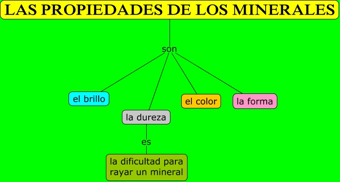 Este Cmap, tiene información relacionada con: Las propiedades de los minerales, LAS PROPIEDADES DE LOS MINERALES son el brillo, la dureza es la dificultad para rayar un mineral, LAS PROPIEDADES DE LOS MINERALES son la dureza, LAS PROPIEDADES DE LOS MINERALES son la forma, LAS PROPIEDADES DE LOS MINERALES son el color