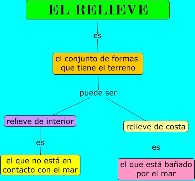 Este Cmap, tiene información relacionada con: El relieve, EL RELIEVE es el conjunto de formas que tiene el terreno, relieve de interior es el que no está en contacto con el mar, relieve de costa es el que está bañado por el mar, el conjunto de formas que tiene el terreno puede ser relieve de interior, el conjunto de formas que tiene el terreno puede ser relieve de costa