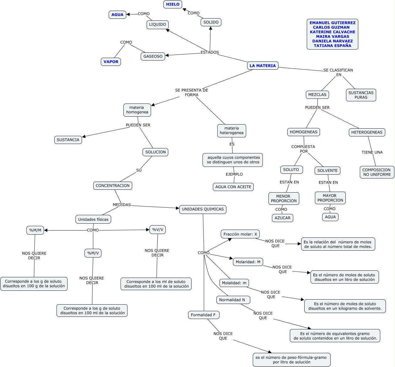 Este Cmap, tiene información relacionada con: l, %V/V NOS QUIERE DECIR Corresponde a los ml de soluto disueltos en 100 ml de la solución, HETEROGENEAS TIENE UNA COMPOSICION NO UNIFORME, Molalidad: m NOS DICE QUE Es el número de moles de soluto disueltos en un kilogramo de solvente., LA MATERIA ESTADOS LIQUIDO, materia homogenea PUEDEN SER SUSTANCIA, LA MATERIA SE PRESENTA DE FORMA materia homogenea, LA MATERIA SE CLASIFICAN EN MEZCLAS, aquella cuyos componentes se distinguen unos de otros EJEMPLO AGUA CON ACEITE, SOLUCION SU CONCENTRACION, CONCENTRACION MEDIDAS UNIDADES QUIMICAS, Formalidad F NOS DICE QUE es el número de peso-fórmula-gramo por litro de solución, MEZCLAS PUEDEN SER HETEROGENEAS, HOMOGENEAS COMPUESTA POR SOLUTO, HOMOGENEAS COMPUESTA POR SOLVENTE, UNIDADES QUIMICAS COMO Molalidad: m, LA MATERIA ESTADOS SOLIDO, UNIDADES QUIMICAS COMO Formalidad F, MEZCLAS PUEDEN SER HOMOGENEAS, Molaridad: M NOS DICE QUE Es el número de moles de soluto disueltos en un litro de solución, GASEOSO COMO VAPOR