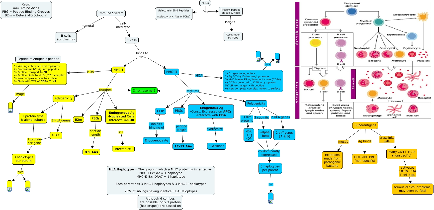 This Concept Map, created with IHMC CmapTools, has information related to: MHC complexes cMAP, PBGs peptide length 12-17 AAs, MHCs fxns Selectively Bind Peptides (selectivity < Abs & TCRs), Polygenicity 2 subinits -alpha -beta, T cells binds to MHC MHC-II, MHC-II features Polygenicity, MHC-II features Chromosome 6, -Exogenous Ag -Const. Expressed on APCs -Interacts with CD4 synthesize Cytokines, Superantigens Ag binds OUTSIDE PBG (non-specific), -Endogenous Ag -Nucleated Cells -Interacts w/CD8 kill infected cell, Present peptide on cell surface purpose Recognition by TCRs, PBGs peptide length 8-9 AAs, -DR -DQ -DP co-dominantly expressed 3 haplotypes per parent, Polygenicity 2 HLA genes 2 diff genes (A & B), MHC-I features Polygenicity, A,B,C 1 protein per gene 3 haplotypes per parent, 2 diff genes (A & B) co-dominantly expressed 3 haplotypes per parent, MHCs fxns Present peptide on cell surface, 3 haplotypes per parent pic, MHC-II features CLIP, MHC-I features PBGs
