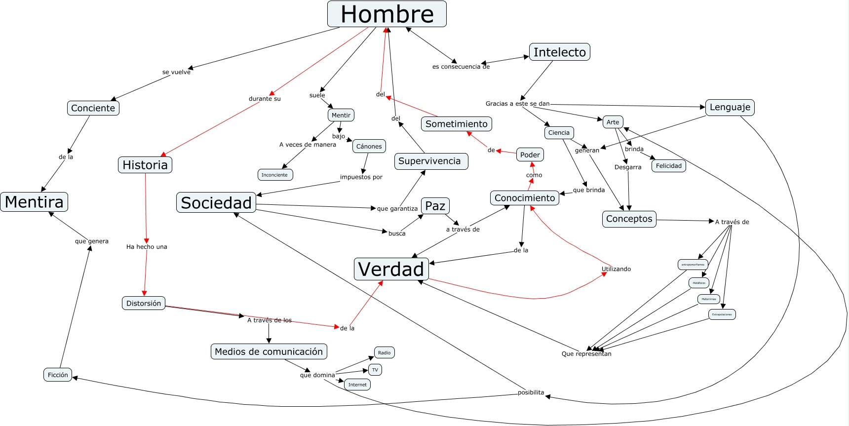 Este Cmap, tiene información relacionada con: Filo, Medios de comunicación que domina TV, Conceptos A través de Extrapolaciones, Extrapolaciones Que representan Verdad, Metonimias Que representan Verdad, Historia Ha hecho una Distorsión, Conceptos A través de Metonimias, Conciente de la Mentira, Lenguaje posibilita Ficción, Metáforas Que representan Verdad, Arte brinda Felicidad, Cánones impuestos por Sociedad, Ciencia generan Conceptos, Conocimiento de la Verdad, Intelecto Gracias a este se dan Lenguaje, Paz a través de Verdad, Conceptos A través de antropomorfismos, Lenguaje posibilita Sociedad, Intelecto Gracias a este se dan Ciencia, Poder de Sometimiento, Conceptos A través de Metáforas
