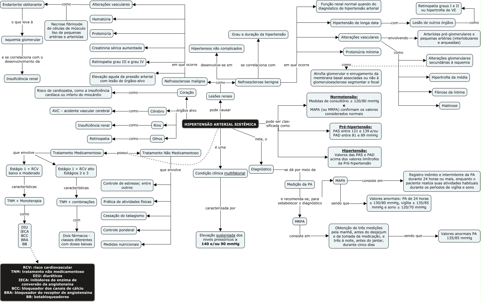 Esse mapa conceitual, produzido no IHMC CmapTools, tem a informação relacionada a: HAS - 1° caso, Medição da PA e recomenda-se, para estabelecer o diagnóstico MRPA, HIPERTENSÃO ARTERIAL SISTÊMICA é uma Condição clínica multifatorial, Tratamento Não Medicamentoso que envolve Medidas nutricionais, Coração como Risco de cardiopatia, como a insuficiência cardíaca ou infarto do miocárdio, HIPERTENSÃO ARTERIAL SISTÊMICA pode causar Lesões renais, Nefroesclerose maligna em que ocorre Alterações vasculares, Lesão de outros órgãos como Retinopatia graus I e II ou hipertrofia de VE, Tratamento Medicamentoso que envolve Estágio 1 + RCV alto Estágios 2 e 3, DIU IECA BCC BRA BB RCV: risco cardiovascular TNM: tratamento não medicamentoso DIU: diuréticos IECA: inibidores da enzima de conversão da angiotensina BCC: bloqueador dos canais de cálcio BRA: bloqueador do receptor de angiotensina BB: betabloqueadores, Alterações glomerulares secundárias à isquemia como Atrofia glomerular e enrugamento da membrana basal associadas ou não à glomeruloesclerose segmentar e focal, HIPERTENSÃO ARTERIAL SISTÊMICA órgãos alvo Olhos, Alterações vasculares como Hialinose, Nefroesclerose benigna em que ocorre Proteinúria mínima, Nefroesclerose maligna em que ocorre Hematúria, Alterações vasculares como Endarterite obliterante, Tratamento Não Medicamentoso que envolve Cessação do tabagismo, HIPERTENSÃO ARTERIAL SISTÊMICA órgãos alvo Rins, Nefroesclerose maligna em que ocorre Elevação aguda da pressão arterial com lesão de órgãos-alvo, Alterações vasculares como Necrose fibrinoide de células de músculo liso de pequenas artérias e arteríolas, Lesões renais como Nefroesclerose maligna