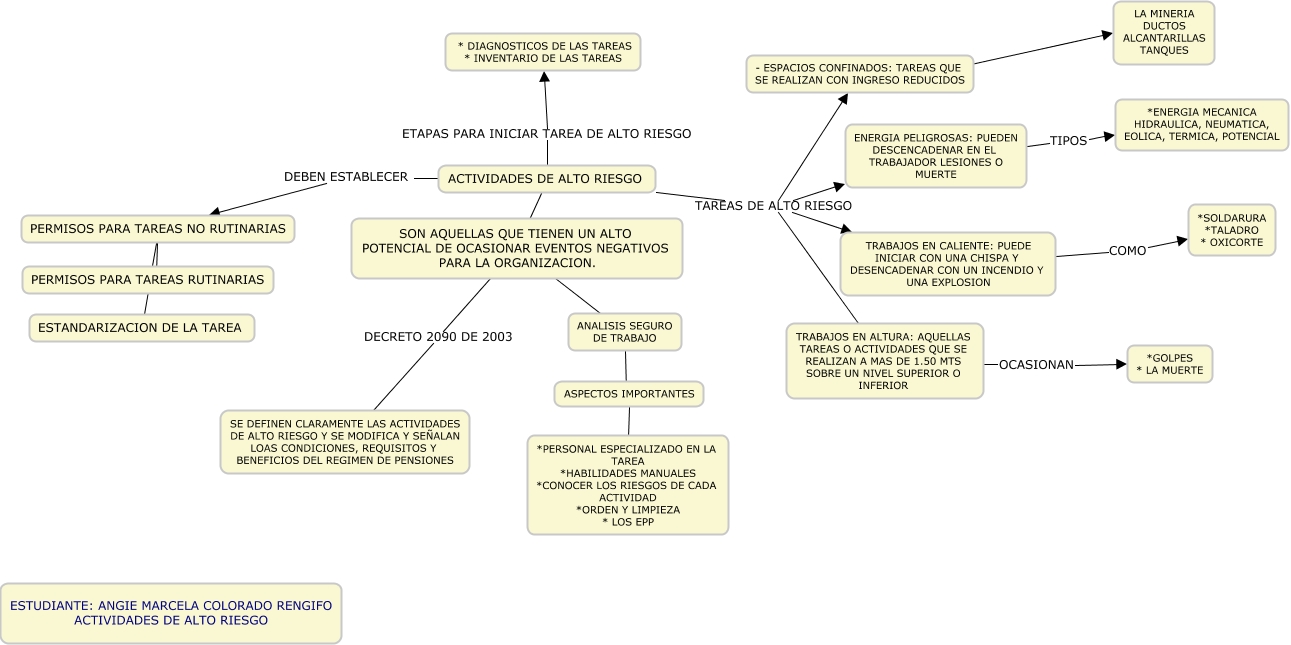 Este Cmap, tiene información relacionada con: ACTIVIDADES DE ALTO RIESGO, ACTIVIDADES DE ALTO RIESGO TAREAS DE ALTO RIESGO ENERGIA PELIGROSAS: PUEDEN DESCENCADENAR EN EL TRABAJADOR LESIONES O MUERTE, ANALISIS SEGURO DE TRABAJO ???? ASPECTOS IMPORTANTES, PERMISOS PARA TAREAS NO RUTINARIAS ???? PERMISOS PARA TAREAS RUTINARIAS, - ESPACIOS CONFINADOS: TAREAS QUE SE REALIZAN CON INGRESO REDUCIDOS ???? LA MINERIA DUCTOS ALCANTARILLAS TANQUES, SON AQUELLAS QUE TIENEN UN ALTO POTENCIAL DE OCASIONAR EVENTOS NEGATIVOS PARA LA ORGANIZACION. DECRETO 2090 DE 2003 SE DEFINEN CLARAMENTE LAS ACTIVIDADES DE ALTO RIESGO Y SE MODIFICA Y SEÑALAN LOAS CONDICIONES, REQUISITOS Y BENEFICIOS DEL REGIMEN DE PENSIONES, ACTIVIDADES DE ALTO RIESGO TAREAS DE ALTO RIESGO TRABAJOS EN ALTURA: AQUELLAS TAREAS O ACTIVIDADES QUE SE REALIZAN A MAS DE 1.50 MTS SOBRE UN NIVEL SUPERIOR O INFERIOR, ACTIVIDADES DE ALTO RIESGO TAREAS DE ALTO RIESGO - ESPACIOS CONFINADOS: TAREAS QUE SE REALIZAN CON INGRESO REDUCIDOS, ACTIVIDADES DE ALTO RIESGO TAREAS DE ALTO RIESGO TRABAJOS EN CALIENTE: PUEDE INICIAR CON UNA CHISPA Y DESENCADENAR CON UN INCENDIO Y UNA EXPLOSION, TRABAJOS EN ALTURA: AQUELLAS TAREAS O ACTIVIDADES QUE SE REALIZAN A MAS DE 1.50 MTS SOBRE UN NIVEL SUPERIOR O INFERIOR OCASIONAN *GOLPES * LA MUERTE, SON AQUELLAS QUE TIENEN UN ALTO POTENCIAL DE OCASIONAR EVENTOS NEGATIVOS PARA LA ORGANIZACION. ???? ANALISIS SEGURO DE TRABAJO, ENERGIA PELIGROSAS: PUEDEN DESCENCADENAR EN EL TRABAJADOR LESIONES O MUERTE TIPOS *ENERGIA MECANICA HIDRAULICA, NEUMATICA, EOLICA, TERMICA, POTENCIAL, PERMISOS PARA TAREAS NO RUTINARIAS ???? ESTANDARIZACION DE LA TAREA, ACTIVIDADES DE ALTO RIESGO ETAPAS PARA INICIAR TAREA DE ALTO RIESGO * DIAGNOSTICOS DE LAS TAREAS * INVENTARIO DE LAS TAREAS, TRABAJOS EN CALIENTE: PUEDE INICIAR CON UNA CHISPA Y DESENCADENAR CON UN INCENDIO Y UNA EXPLOSION COMO *SOLDARURA *TALADRO * OXICORTE, ACTIVIDADES DE ALTO RIESGO ???? SON AQUELLAS QUE TIENEN UN ALTO POTENCIAL DE OCASIONAR EVENTOS NEGATIVOS PARA LA ORGANIZACION., ASPECTOS IMPORTANTES ???? *PERSONAL ESPECIALIZADO EN LA TAREA *HABILIDADES MANUALES *CONOCER LOS RIESGOS DE CADA ACTIVIDAD *ORDEN Y LIMPIEZA * LOS EPP, ACTIVIDADES DE ALTO RIESGO DEBEN ESTABLECER PERMISOS PARA TAREAS NO RUTINARIAS