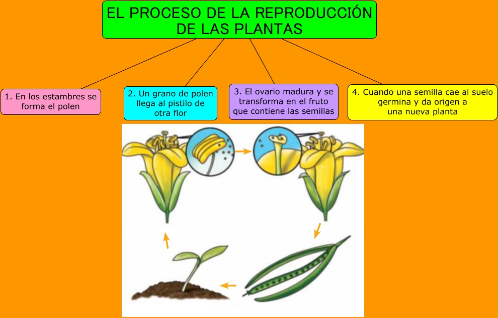 Este Cmap, tiene información relacionada con: El proceso de reproducción de las plantas, EL PROCESO DE LA REPRODUCCIÓN DE LAS PLANTAS 2. Un grano de polen llega al pistilo de otra flor, EL PROCESO DE LA REPRODUCCIÓN DE LAS PLANTAS 3. El ovario madura y se transforma en el fruto que contiene las semillas, EL PROCESO DE LA REPRODUCCIÓN DE LAS PLANTAS 1. En los estambres se forma el polen, EL PROCESO DE LA REPRODUCCIÓN DE LAS PLANTAS 4. Cuando una semilla cae al suelo germina y da origen a una nueva planta