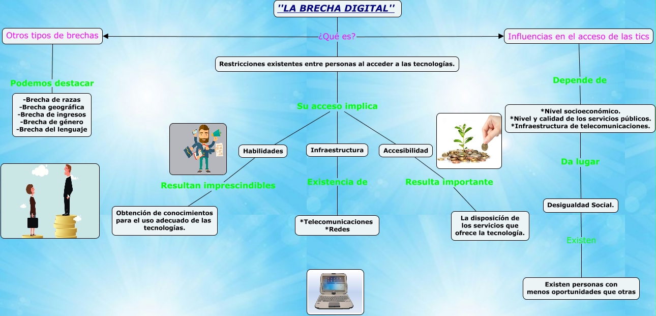 Este Cmap, tiene información relacionada con: practica 1, *Nivel socioeconómico. *Nivel y calidad de los servicios públicos. *Infraestructura de telecomunicaciones. Da lugar Desigualdad Social., Restricciones existentes entre personas al acceder a las tecnologías. Su acceso implica Accesibilidad, Otros tipos de brechas Podemos destacar -Brecha de razas -Brecha geográfica -Brecha de ingresos -Brecha de género -Brecha del lenguaje, Infraestructura Existencia de *Telecomunicaciones *Redes, Accesibilidad Resulta importante La disposicíón de los servicios que ofrece la tecnología., Desigualdad Social. Existen Existen personas con menos oportunidades que otras, Restricciones existentes entre personas al acceder a las tecnologías. Su acceso implica Habilidades, ''LA BRECHA DIGITAL'' ¿Qué es? Restricciones existentes entre personas al acceder a las tecnologías., ''LA BRECHA DIGITAL'' ¿Qué es? Otros tipos de brechas, Influencias en el acceso de las tics Depende de *Nivel socioeconómico. *Nivel y calidad de los servicios públicos. *Infraestructura de telecomunicaciones., Restricciones existentes entre personas al acceder a las tecnologías. Su acceso implica Infraestructura, ''LA BRECHA DIGITAL'' ¿Qué es? Influencias en el acceso de las tics, Habilidades Resultan imprescindibles Obtención de conocimientos para el uso adecuado de las tecnologías.