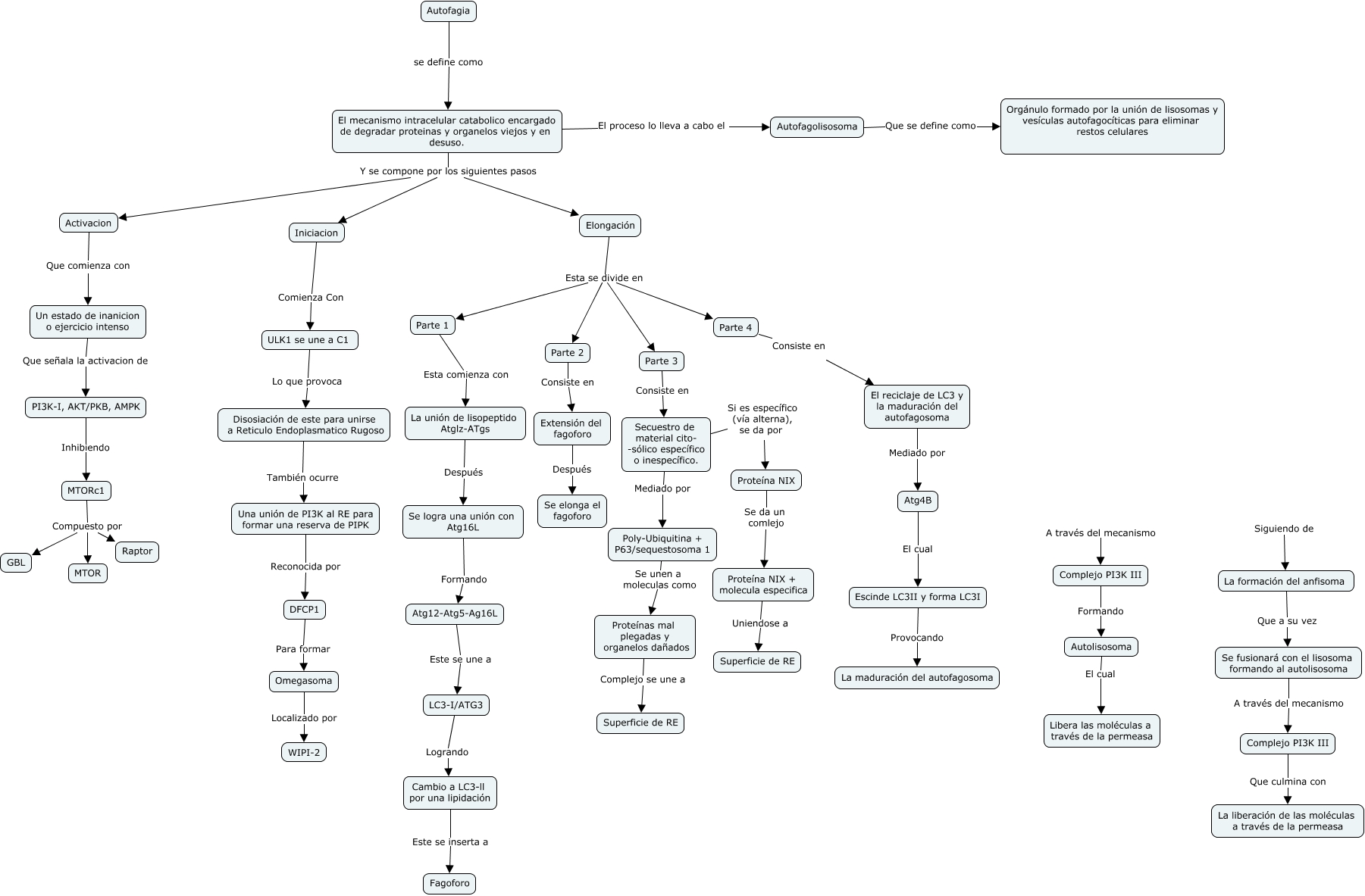 This Concept Map, created with IHMC CmapTools, has information related to: Procesamiento2Mapa2, Se logra una unión con Atg16L Formando Atg12-Atg5-Ag16L, MTORc1 Compuesto por Raptor, Elongación Esta se divide en Parte 4, El reciclaje de LC3 y la maduración del autofagosoma Mediado por Atg4B, Autofagia se define como El mecanismo intracelular catabolico encargado de degradar proteinas y organelos viejos y en desuso., Parte 3 Consiste en Secuestro de material cito- -sólico específico o inespecífico., Autolisosoma El cual Libera las moléculas a través de la permeasa, La unión de lisopeptido Atglz-ATgs Después Se logra una unión con Atg16L, Cambio a LC3-ll por una lipidación Este se inserta a Fagoforo, Atg12-Atg5-Ag16L Este se une a LC3-I/ATG3, Proteína NIX + molecula especifica Uniendose a Superficie de RE, Activacion Que comienza con Un estado de inanicion o ejercicio intenso, Parte 4 Consiste en El reciclaje de LC3 y la maduración del autofagosoma, El mecanismo intracelular catabolico encargado de degradar proteinas y organelos viejos y en desuso. Y se compone por los siguientes pasos Activacion, Complejo PI3K III Que culmina con La liberación de las moléculas a través de la permeasa, Omegasoma Localizado por WIPI-2, LC3-I/ATG3 Logrando Cambio a LC3-ll por una lipidación, El mecanismo intracelular catabolico encargado de degradar proteinas y organelos viejos y en desuso. Y se compone por los siguientes pasos Iniciacion, Escinde LC3II y forma LC3I Provocando La maduración del autofagosoma, Autofagolisosoma Que se define como Orgánulo formado por la unión de lisosomas y vesículas autofagocíticas para eliminar restos celulares
