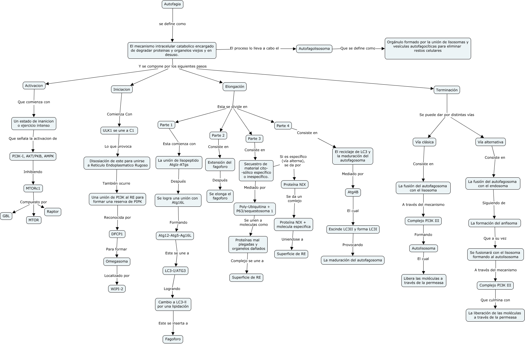 Este Cmap, tiene información relacionada con: Angel 2, Secuestro de material cito- -sólico específico o inespecífico. Mediado por Poly-Ubiquitina + P63/sequestosoma 1, El mecanismo intracelular catabolico encargado de degradar proteinas y organelos viejos y en desuso. Y se compone por los siguientes pasos Terminación, El mecanismo intracelular catabolico encargado de degradar proteinas y organelos viejos y en desuso. Y se compone por los siguientes pasos Activacion, El mecanismo intracelular catabolico encargado de degradar proteinas y organelos viejos y en desuso. Y se compone por los siguientes pasos Elongación, MTORc1 Compuesto por MTOR, Cambio a LC3-ll por una lipidación Este se inserta a Fagoforo, Terminación Se puede dar por distintas vías Vía clásica, Vía alternativa Consiste en La fusión del autofagosoma con el endosoma, Vía clásica Consiste en La fusión del autofagosoma con el lisosoma, Escinde LC3II y forma LC3I Provocando La maduración del autofagosoma, Parte 4 Consiste en El reciclaje de LC3 y la maduración del autofagosoma, Complejo PI3K III Que culmina con La liberación de las moléculas a través de la permeasa, Autofagolisosoma Que se define como Orgánulo formado por la unión de lisosomas y vesículas autofagocíticas para eliminar restos celulares, ULK1 se une a C1 Lo que provoca Disosiación de este para unirse a Reticulo Endoplasmatico Rugoso, Elongación Esta se divide en Parte 4, Secuestro de material cito- -sólico específico o inespecífico. Si es específico (vía alterna), se da por Proteína NIX, Proteínas mal plegadas y organelos dañados Complejo se une a Superficie de RE, La fusión del autofagosoma con el lisosoma A través del mecanismo Complejo PI3K III, Atg12-Atg5-Ag16L Este se une a LC3-I/ATG3, MTORc1 Compuesto por Raptor