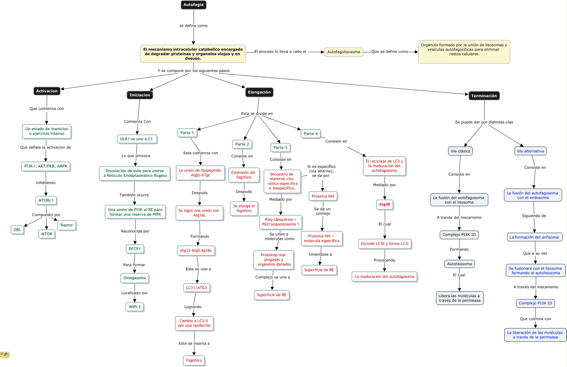 This Concept Map, created with IHMC CmapTools, has information related to: LUISROBLES CMAP FINAL META2.1, Secuestro de material cito- -sólico específico o inespecífico. Mediado por Poly-Ubiquitina + P63/sequestosoma 1, El mecanismo intracelular catabolico encargado de degradar proteinas y organelos viejos y en desuso. Y se compone por los siguientes pasos Terminación, El mecanismo intracelular catabolico encargado de degradar proteinas y organelos viejos y en desuso. Y se compone por los siguientes pasos Activacion, El mecanismo intracelular catabolico encargado de degradar proteinas y organelos viejos y en desuso. Y se compone por los siguientes pasos Elongación, MTORc1 Compuesto por MTOR, Cambio a LC3-ll por una lipidación Este se inserta a Fagoforo, Terminación Se puede dar por distintas vías Vía clásica, Vía alternativa Consiste en La fusión del autofagosoma con el endosoma, Vía clásica Consiste en La fusión del autofagosoma con el lisosoma, Escinde LC3II y forma LC3I Provocando La maduración del autofagosoma, Parte 4 Consiste en El reciclaje de LC3 y la maduración del autofagosoma, Complejo PI3K III Que culmina con La liberación de las moléculas a través de la permeasa, Autofagolisosoma Que se define como Orgánulo formado por la unión de lisosomas y vesículas autofagocíticas para eliminar restos celulares, ULK1 se une a C1 Lo que provoca Disosiación de este para unirse a Reticulo Endoplasmatico Rugoso, Elongación Esta se divide en Parte 4, Secuestro de material cito- -sólico específico o inespecífico. Si es específico (vía alterna), se da por Proteína NIX, Proteínas mal plegadas y organelos dañados Complejo se une a Superficie de RE, La fusión del autofagosoma con el lisosoma A través del mecanismo Complejo PI3K III, Atg12-Atg5-Ag16L Este se une a LC3-I/ATG3, MTORc1 Compuesto por Raptor