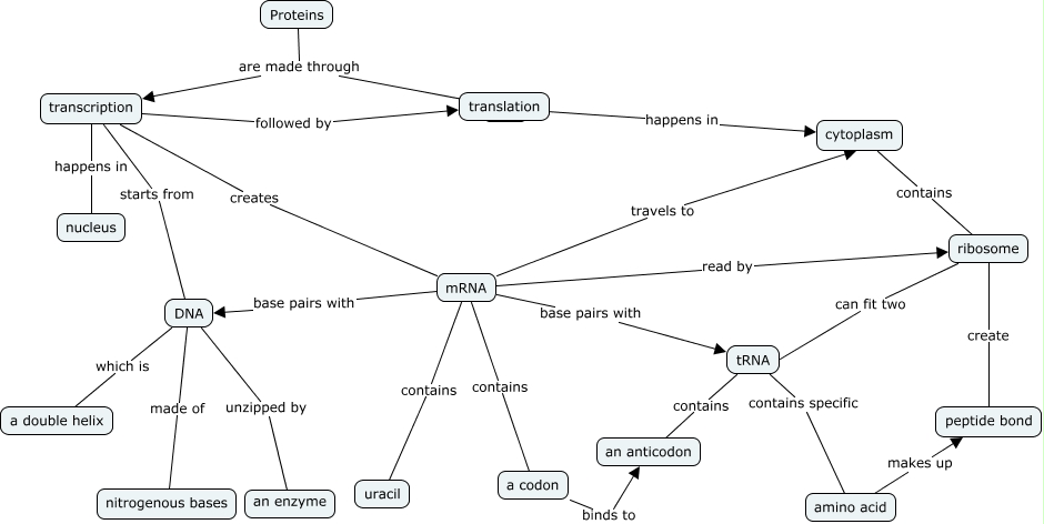 This Concept Map, created with IHMC CmapTools, has information related to: Protein Synthesis, DNA made of nitrogenous bases, Proteins are made through transcription, ribosome can fit two tRNA, DNA which is a double helix, ???? happens in cytoplasm, mRNA contains uracil, mRNA travels to cytoplasm, mRNA base pairs with tRNA, tRNA contains specific amino acid, Proteins are made through ????, amino acid makes up peptide bond, ribosome create peptide bond, mRNA contains a codon, transcription creates mRNA, transcription starts from DNA, mRNA read by ribosome, a codon binds to an anticodon, DNA unzipped by an enzyme, transcription happens in nucleus, tRNA contains an anticodon
