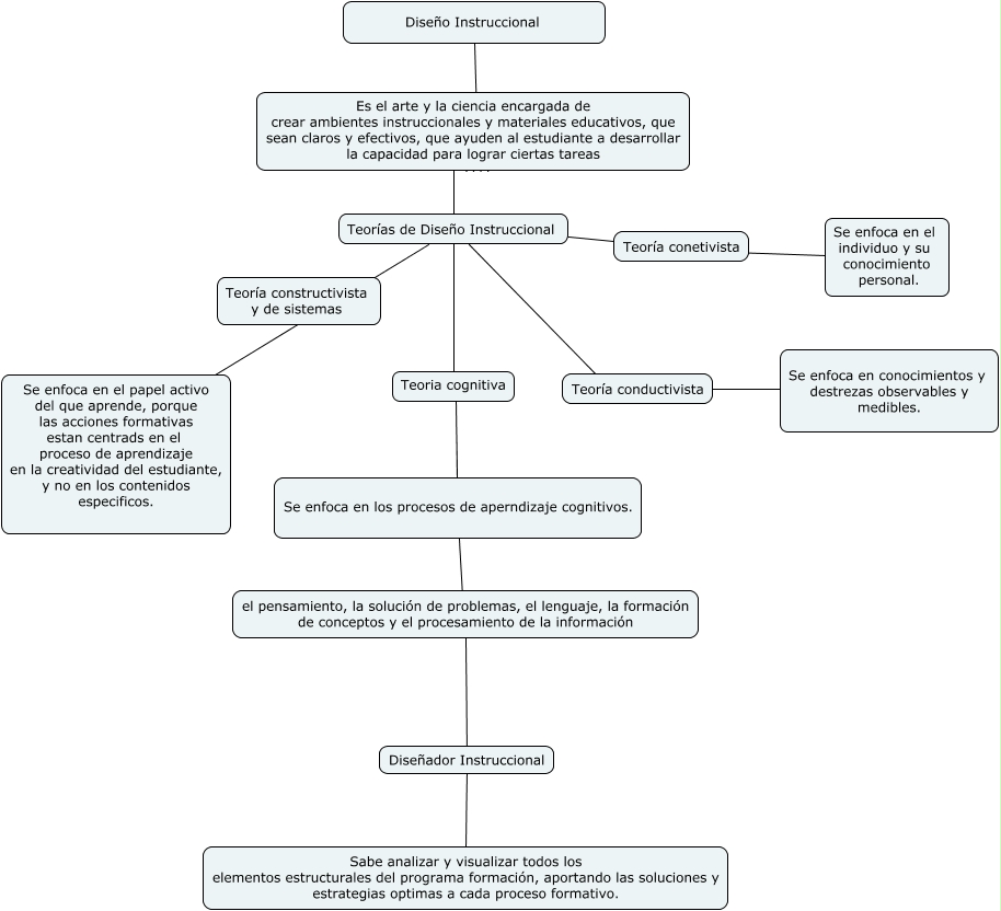 Este Cmap, tiene información relacionada con: Cmap 1, Teorías de Diseño Instruccional ???? Se enfoca en el papel activo del que aprende, porque las acciones formativas estan centrads en el proceso de aprendizaje en la creatividad del estudiante, y no en los contenidos especificos., Teorías de Diseño Instruccional ???? Teoría conductivista, Sabe analizar y visualizar todos los elementos estructurales del programa formación, aportando las soluciones y estrategias optimas a cada proceso formativo. ???? Diseñador Instruccional, el pensamiento, la solución de problemas, el lenguaje, la formación de conceptos y el procesamiento de la información ???? Diseñador Instruccional, Se enfoca en los procesos de aperndizaje cognitivos. ???? Teoria cognitiva, Teorías de Diseño Instruccional ???? Es el arte y la ciencia encargada de crear ambientes instruccionales y materiales educativos, que sean claros y efectivos, que ayuden al estudiante a desarrollar la capacidad para lograr ciertas tareas, Teoria cognitiva ???? Teorías de Diseño Instruccional, Se enfoca en los procesos de aperndizaje cognitivos. ???? el pensamiento, la solución de problemas, el lenguaje, la formación de conceptos y el procesamiento de la información, Teoría conetivista ???? Teorías de Diseño Instruccional, Teoría conductivista ???? Se enfoca en conocimientos y destrezas observables y medibles., Diseño Instruccional ???? Es el arte y la ciencia encargada de crear ambientes instruccionales y materiales educativos, que sean claros y efectivos, que ayuden al estudiante a desarrollar la capacidad para lograr ciertas tareas, Se enfoca en el individuo y su conocimiento personal. ???? Teoría conetivista