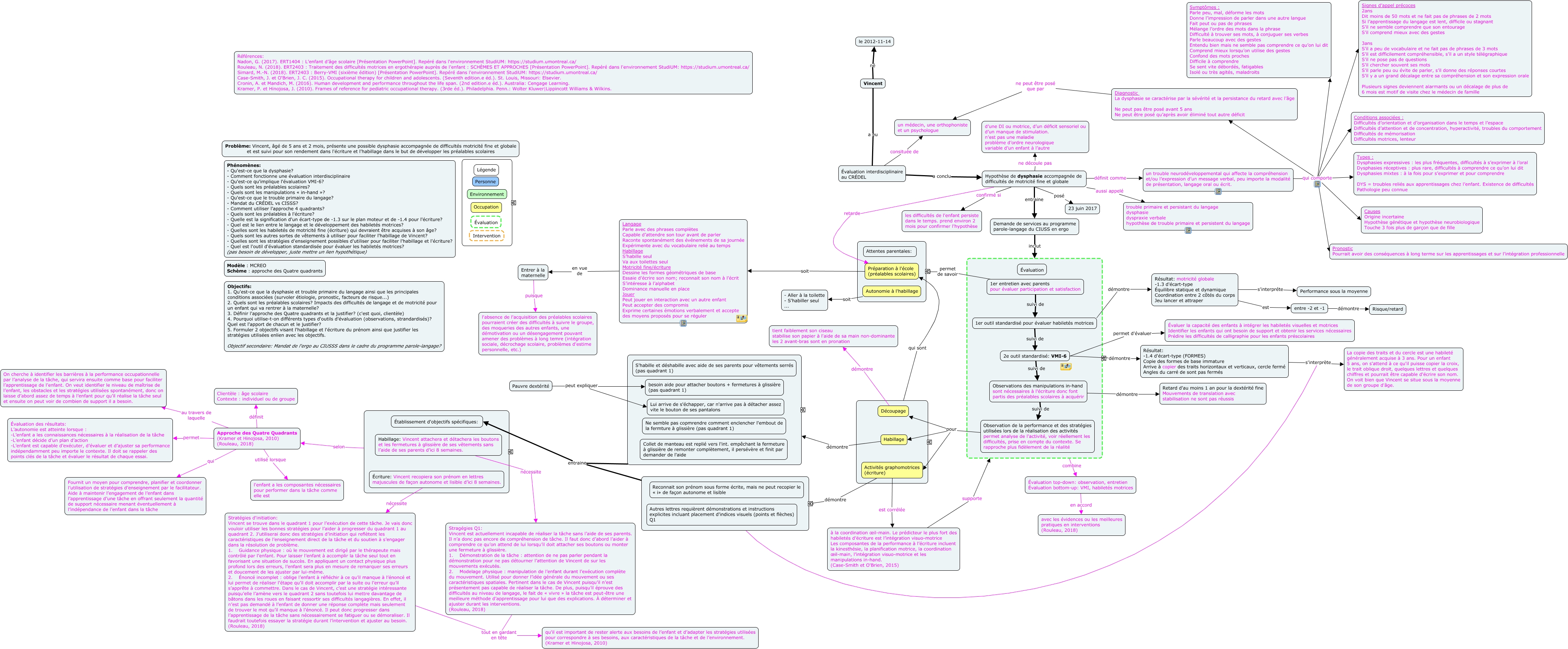 Cette carte de concepts créée avec IHMC CmapTools traite de: Groupe4_Vignette4_sarah, Habillage démontre ????, ???? qui sont Préparation à l'école (préalables scolaires), 1er entretien avec parents pour évaluer participation et satisfaction suivi de 1er outil standardisé pour évaluer habiletés motrices, Résultat: motricité globale -1.3 d'écart-type Équilibre statique et dynamique Coordination entre 2 côtés du corps Jeu lancer et attraper est entre -2 et -1, Habillage: Vincent attachera et détachera les boutons et les fermetures à glissière de ses vêtements sans l’aide de ses parents d’ici 8 semaines. nécessite Stragégies Q1: Vincent est actuellement incapable de réaliser la tâche sans l’aide de ses parents. Il n’a donc pas encore de compréhension de tâche. Il faut donc d’abord l’aider à comprendre ce qu’on attend de lui lorsqu’il doit attacher ses boutons ou monter une fermeture à glissière. 1. Démonstration de la tâche : attention de ne pas parler pendant la démonstration pour ne pas détourner l’attention de Vincent de sur les mouvements exécutés. 2. Modelage physique : manipulation de l’enfant durant l’exécution complète du mouvement. Utilisé pour donner l’idée générale du mouvement ou ses caractéristiques spatiales. Pertinent dans le cas de Vincent puisqu’il n’est présentement pas capable de réaliser la tâche. De plus, puisqu’il éprouve des difficultés au niveau de langage, le fait de « vivre » la tâche est peut-être une meilleure méthode d’apprentissage pour lui que des explications. À déterminer et ajuster durant les interventions. (Rouleau, 2018), Hypothèse de dysphasie accompagnée de difficultés de motricité fine et globale entraine Demande de services au programme parole-langage du CIUSS en ergo, un trouble neurodéveloppemental qui affecte la compréhension et/ou l’expression d’un message verbal, peu importe la modalité de présentation, langage oral ou écrit. qui comporte Diagnostic La dysphasie se caractérise par la sévérité et la persistance du retard avec l’âge Ne peut pas être posé avant 5 ans Ne peut être posé qu’après avoir éliminé tout autre déficit, Observations des manipulations in-hand sont nécessaires à l'écriture donc font partis des préalables scolaires à acquérir démontre Retard d'au moins 1 an pour la dextérité fine Mouvements de translation avec stabilisation ne sont pas réussis, Approche des Quatre Quadrants (Kramer et Hinojosa, 2010) (Rouleau, 2018) définit Clientèle : âge scolaire Contexte : individuel ou de groupe, Hypothèse de dysphasie accompagnée de difficultés de motricité fine et globale ne découle pas d’une DI ou motrice, d’un déficit sensoriel ou d’un manque de stimulation. n’est pas une maladie problème d’ordre neurologique variable d’un enfant à l’autre, Évaluation top-down: observation, entretien Évaluation bottom-up: VMI, habiletés motrices en accord avec les évidences ou les meilleures pratiques en interventions (Rouleau, 2018), Écriture: Vincent recopiera son prénom en lettres majuscules de façon autonome et lisible d’ici 8 semaines. nécessite Stratégies d'initiation: Vincent se trouve dans le quadrant 1 pour l’exécution de cette tâche. Je vais donc vouloir utiliser les bonnes stratégies pour l’aider à progresser du quadrant 1 au quadrant 2. J’utiliserai donc des stratégies d’initiation qui reflètent les caractéristiques de l’enseignement direct de la tâche et du soutien à s’engager dans la résolution de problème. 1. Guidance physique : où le mouvement est dirigé par le thérapeute mais contrôlé par l’enfant. Pour laisser l’enfant à accomplir la tâche seul tout en favorisant une situation de succès. En appliquant un contact physique plus profond lors des erreurs, l’enfant sera plus en mesure de remarquer ses erreurs et doucement de les ajuster par lui-même. 2. Énoncé incomplet : oblige l’enfant à réfléchir à ce qu’il manque à l’énoncé et lui permet de réaliser l’étape qu’il doit accomplir par la suite ou l’erreur qu’il s’apprête à commettre. Dans le cas de Vincent, c’est une stratégie intéressante puisqu’elle l’amène vers le quadrant 2 sans toutefois lui mettre davantage de bâtons dans les roues en faisant ressortir ses difficultés langagières. En effet, il n’est pas demandé à l’enfant de donner une réponse complète mais seulement de trouver le mot qu’il manque à l’énoncé. Il peut donc progresser dans l’apprentissage de la tâche sans nécessairement se fatiguer ou se démoraliser. Il faudrait toutefois essayer la stratégie durant l’intervention et ajuster au besoin. (Rouleau, 2018), 1er entretien avec parents pour évaluer participation et satisfaction permet de savoir ????, 2e outil standardisé: VMI-6 permet d'évaluer Évaluer la capacité des enfants à intégrer les habiletés visuelles et motrices Identifier les enfants qui ont besoin de support et obtenir les services nécessaires Prédire les difficultés de calligraphie pour les enfants préscolaires, ???? entraine Établissement d'objectifs spécifiques:, Hypothèse de dysphasie accompagnée de difficultés de motricité fine et globale aussi appelé trouble primaire et persistant du langage dysphasie dyspraxie verbale hypothèse de trouble primaire et persistent du langage, Stratégies d'initiation: Vincent se trouve dans le quadrant 1 pour l’exécution de cette tâche. Je vais donc vouloir utiliser les bonnes stratégies pour l’aider à progresser du quadrant 1 au quadrant 2. J’utiliserai donc des stratégies d’initiation qui reflètent les caractéristiques de l’enseignement direct de la tâche et du soutien à s’engager dans la résolution de problème. 1. Guidance physique : où le mouvement est dirigé par le thérapeute mais contrôlé par l’enfant. Pour laisser l’enfant à accomplir la tâche seul tout en fa