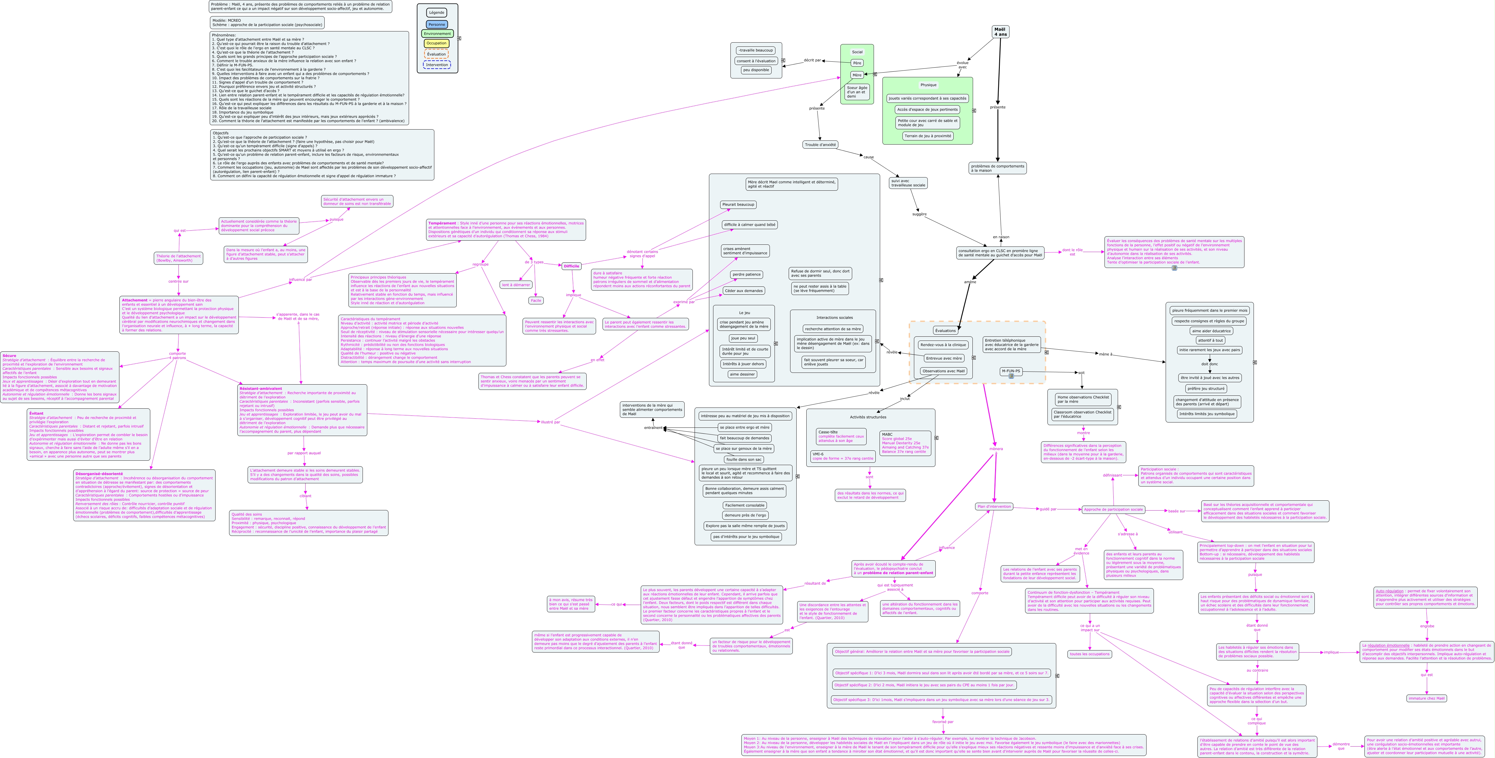Cette carte de concepts créée avec IHMC CmapTools traite de: Groupe4_Vignette8_sarah, Attachement = pierre angulaire du bien-être des enfants et essentiel à un développement sain C’est un système biologique permettant la protection physique et le développement psychologique Qualité du lien d’attachement a un impact sur le développement cérébral par modifications neurochimiques et changement dans l’organisation neurale et influence, à + long terme, la capacité à former des relations. comporte 4 patrons Désorganisé-désorienté Stratégie d’attachement : Incohérence ou désorganisation du comportement en situation de détresse se manifestant par: des comportements contradictoires (approche/évitement), signes de désorientation et d’appréhension à l’égard du parent: source de protection = source de peur Caractéristiques parentales : Comportements hostiles ou d’impuissance Impacts fonctionnels possibles Renversement des rôles: Contrôle nourricier, contrôle punitif Associé à un risque accru de: difficultés d’adaptation sociale et de régulation émotionnelle (problèmes de comportement),difficultés d’apprentissage (échecs scolaires, déficits cognitifs, faibles compétences métacognitives), ???? sont des résultats dans les normes, ce qui exclut le retard de développement, Approche de participation sociale met en évidence Les relations de l’enfant avec ses parents durant la petite enfance représentent les fondations de leur développement social., Résistant-ambivalent Stratégie d’attachement : Recherche importante de proximité au détriment de l’exploration Caractéristiques parentales : Inconsistant (parfois sensible, parfois rejetant ou intrusif) Impacts fonctionnels possibles Jeu et apprentissages : Exploration limitée, le jeu peut avoir du mal à s’organiser, développement cognitif peut être privilégié au détriment de l’exploration Autonomie et régulation émotionnelle : Demande plus que nécessaire l’accompagnement du parent, plus dépendant illustré par ????, Résistant-ambivalent Stratégie d’attachement : Recherche importante de proximité au détriment de l’exploration Caractéristiques parentales : Inconsistant (parfois sensible, parfois rejetant ou intrusif) Impacts fonctionnels possibles Jeu et apprentissages : Exploration limitée, le jeu peut avoir du mal à s’organiser, développement cognitif peut être privilégié au détriment de l’exploration Autonomie et régulation émotionnelle : Demande plus que nécessaire l’accompagnement du parent, plus dépendant par rapport auquel L’attachement demeure stable si les soins demeurent stables. S’il y a des changements dans la qualité des soins, possibles modifications du patron d’attachement, Maël 4 ans présente problèmes de comportements à la maison, Approche de participation sociale basée sur Basé sur les théories acquisitionnelle et comportementale qui conceptualisent comment l’enfant apprend à participer efficacement dans des situations sociales et comment favoriser le développement des habiletés nécessaires à la participation sociale., Après avoir écouté le compte-rendu de l'évaluation, le pédopsychiatre conclut à un problème de relation parent-enfant qui est typiquement associé à une altération du fonctionnement dans les domaines comportementaux, cognitifs ou affectifs de l'enfant., Actuellement considérée comme la théorie dominante pour la compréhension du développement social précoce puisque Dans la mesure où l’enfant a, au moins, une figure d’attachement stable, peut s’attacher à d’autres figures, consultation ergo en CLSC en première ligne de santé mentale au guichet d'accès pour Maël en raison problèmes de comportements à la maison, Difficile dénotant certains signes d'appel dure à satisfaire humeur négative fréquente et forte réaction patrons irréguliers de sommeil et d’alimentation répondent moins aux actions réconfortantes du parent, se place sur genoux de la mère entraînent interventions de la mère qui semble alimenter comportements de Maël, Le parent peut également ressentir les interactions avec l’enfant comme stressantes. exprimé par perdre patience, Observations avec Maël inclut Activités structurées, Actuellement considérée comme la théorie dominante pour la compréhension du développement social précoce puisque Sécurité d’attachement envers un donneur de soins est non transférable, Résistant-ambivalent Stratégie d’attachement : Recherche importante de proximité au détriment de l’exploration Caractéristiques parentales : Inconsistant (parfois sensible, parfois rejetant ou intrusif) Impacts fonctionnels possibles Jeu et apprentissages : Exploration limitée, le jeu peut avoir du mal à s’organiser, développement cognitif peut être privilégié au détriment de l’exploration Autonomie et régulation émotionnelle : Demande plus que nécessaire l’accompagnement du parent, plus dépendant illustré par ????, Attachement = pierre angulaire du bien-être des enfants et essentiel à un développement sain C’est un système biologique permettant la protection physique et le développement psychologique Qualité du lien d’attachement a un impact sur le développement cérébral par modifications neurochimiques et changement dans l’organisation neurale et influence, à + long terme, la capacité à former des relations. comporte 4 patrons Évitant Stratégie d’attachement : Peu de recherche de proximité et privilégie l’exploration Caractéristiques parentales : Distant et rejetant, parfois intrusif Impacts fonctionnels possibles Jeu et apprentissages : L’exploration permet de combler le besoin d’expérimenter mais aussi d’éviter d’être en relation Autonomie et régulation émotionnelle : Ne donne pas les bons signaux, cherche à faire sans l’aide de l’adulte même s’il en a besoin, en apparence plus autonome, peut
