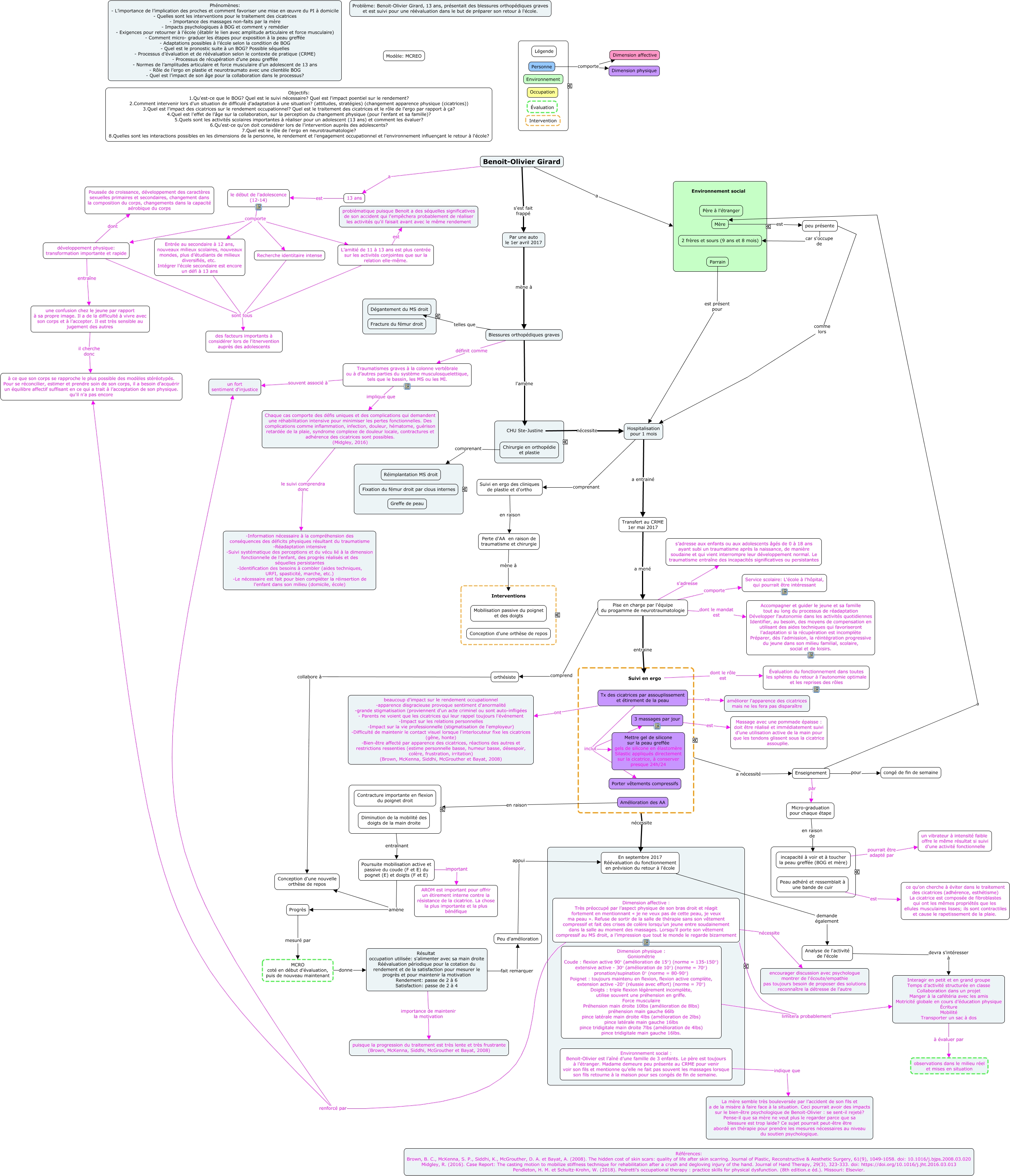 Cette carte de concepts créée avec IHMC CmapTools traite de: Groupe4_vignette6_sarah, Mère est peu présente, Benoit-Olivier Girard a 13 ans, Pise en charge par l'équipe du progamme de neurotraumatologie entraine Suivi en ergo, le début de l'adolescence (12-14) comporte Entrée au secondaire à 12 ans, nouveaux milieux scolaires, nouveaux mondes, plus d’étudiants de milieux diversifiés, etc. Intégrer l’école secondaire est encore un défi à 13 ans, L’amitié de 11 à 13 ans est plus centrée sur les activités conjointes que sur la relation elle-même. est problématique puisque Benoit a des séquelles significatives de son accident qui l'empêchera probablement de réaliser les activités qu'il faisait avant avec le même rendement, Pise en charge par l'équipe du progamme de neurotraumatologie comprend orthésiste, Peu d'amélioration appui En septembre 2017 Réévaluation du fonctionnement en prévision du retour à l'école, développement physique: transformation importante et rapide dont Poussée de croissance, développement des caractères sexuelles primaires et secondaires, changement dans la composition du corps, changements dans la capacité aérobique du corps, Tx des cicatrices par assouplissement et étirement de la peau ont beaucoup d'impact sur le rendement occupationnel -apparence disgracieuse provoque sentiment d'anormalité -grande stigmatisation (proviennent d'un acte criminel ou sont auto-infligées - Parents ne voient que les cicatrices qui leur rappel toujours l'événement -Impact sur les relations personnelles -Impact sur la vie professionnelle (stigmatisation de l'employeur) -Difficulté de maintenir le contact visuel lorsque l'interlocuteur fixe les cicatrices (gêne, honte) -Bien-être affecté par apparence des cicatrices, réactions des autres et restrictions ressenties (estime personnelle basse, humeur basse, désespoir, colère, frustration, irritation) (Brown, McKenna, Siddhi, McGrouther et Bayat, 2008), Benoit-Olivier Girard s'est fait frappé Par une auto le 1er avril 2017, Résultat occupation utilisée: s'alimenter avec sa main droite Réévaluation périodique pour la cotation du rendement et de la satisfaction pour mesurer le progrès et pour maintenir la motivation Rendement: passe de 2 à 6 Satisfaction: passe de 2 à 4 importance de maintenir la motivation puisque la progression du traitement est très lente et très frustrante (Brown, McKenna, Siddhi, McGrouther et Bayat, 2008), Micro-graduation pour chaque étape en raison de incapacité à voir et à toucher la peau greffée (BOG et mère), Entrée au secondaire à 12 ans, nouveaux milieux scolaires, nouveaux mondes, plus d’étudiants de milieux diversifiés, etc. Intégrer l’école secondaire est encore un défi à 13 ans sont tous des facteurs importants à considérer lors de l'itnervention auprès des adolescents, Tx des cicatrices par assouplissement et étirement de la peau inclut 3 massages par jour, 13 ans est le début de l'adolescence (12-14), Suivi en ergo dont le rôle est Évaluation du fonctionnement dans toutes les sphères du retour à l’autonomie optimale et les reprises des rôles, Perte d'AA en raison de traumatisme et chirurgie mène à Interventions, Progrès mesuré par MCRO coté en début d'évaluation, puis de nouveau maintenant, Analyse de l'activité de l'école devra s'intéresser à Interagir en petit et en grand groupe Temps d’activité structurée en classe Collaboration dans un projet Manger à la cafétéria avec les amis Motricité globale en cours d’éducation physique Écriture Mobilité Transporter un sac à dos, le début de l'adolescence (12-14) comporte Recherche identitaire intense