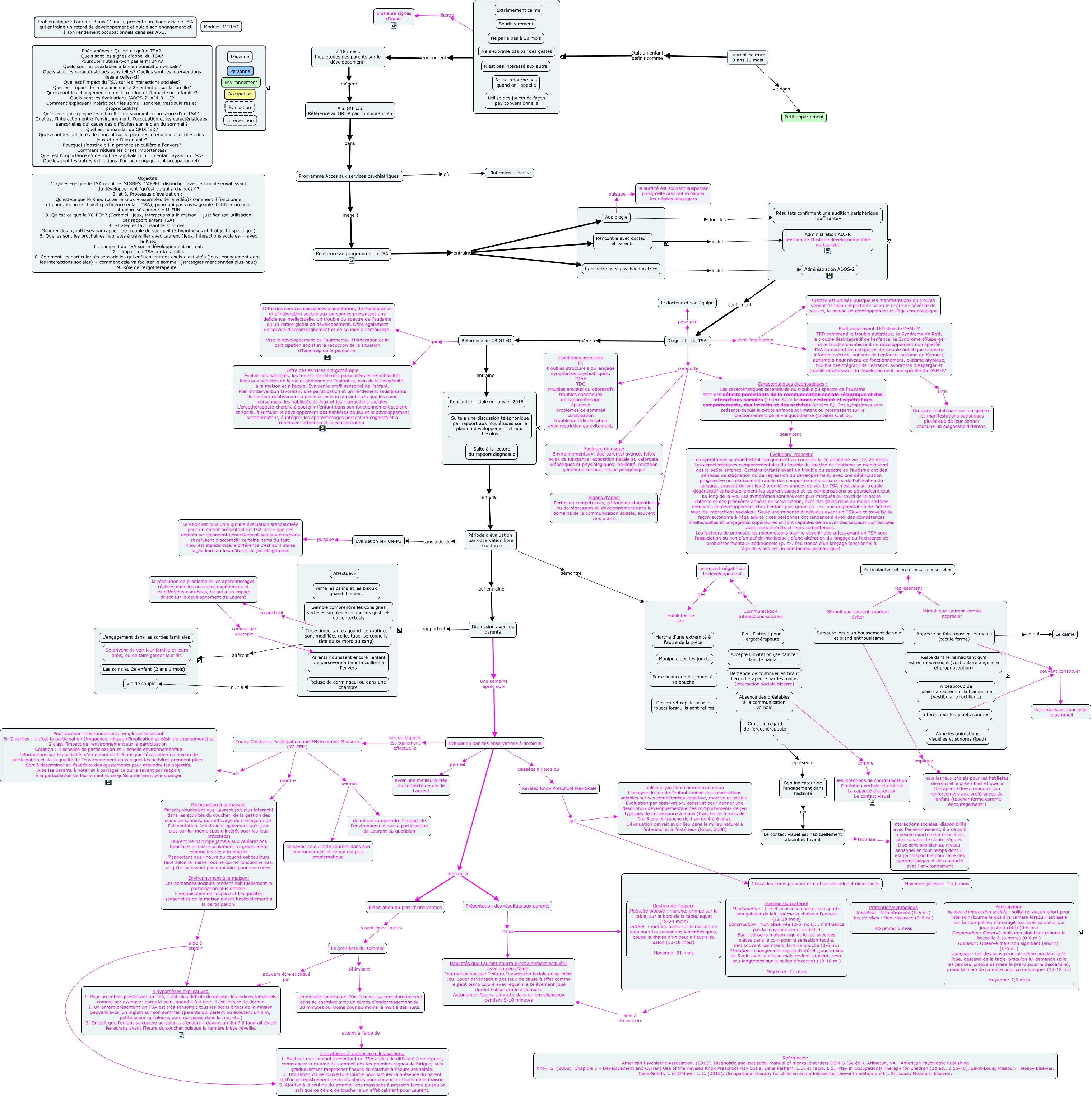 Cette carte de concepts créée avec IHMC CmapTools traite de: Groupe4_Vignette7_sarah, Était auparavant TED dans le DSM-IV TED comprend le trouble autistique, le Syndrome de Rett, le trouble désintégratif de l’enfance, le Syndrome d’Asperger et le trouble envahissant du développement non spécifié TSA comprend les catégories de trouble autistique (autisme infantile précoce, autisme de l’enfance, autisme de Kanner), autisme à haut niveau de fonctionnement, autisme atypique, trouble désintégratif de l’enfance, syndrome d’Asperger et trouble envahissant du développement non spécifié du DSM-IV. ainsi On place maintenant sur un spectre les manifestations autistiques plutôt que de leur donner chacune un diagnostic différent., Présentation des résultats aux parents inclut Habiletés que Laurent pourra prochainement acquiérir avec un peu d'aide: Interaction sociale: Imitera l'expression faciale de sa mère Jeu: Jouer davantage à des jeux de cause à effet comme le petit piano coloré avec lequel il a brièvement joué durant l'observation à domicile Autonomie: Pourra s'investir dans un jeu silencieux pendant 5-10 minutes, Participation à la maison: Parents voudraient que Laurent soit plus interactif dans les activités du coucher, de la gestion des soins personnels, du nettoyage du ménage et de l'alimentation. Voudraient également qu'il joue plus par lui-même (pas d'intérêt pour les jeux présentés) Laurent ne participe jamais aux célébrations familiales et tolère seulement sa grand-mère comme invitée à la maison Rapportent que l'heure du couché est toujours faite selon la même routine qui ne fonctionne pas, et qu'ils ne savent pas quoi faire pour ses crises. Environnement à la maison: Les demandes sociales rendent habituellement la participation plus difficile. L'organisation de l'espace et les qualités sensorielles de la maison aident habituellement à la participation. aide à établir 3 hypothèses explicatives: 1. Pour un enfant présentant un TSA, il est plus difficile de décoter les indices temporels, comme par exemple: après le bain, quand il fait noir, il est l'heure de dormir. 2. Un enfant présentant un TSA est très sensoriel; tous les petits bruits de la maison peuvent avoir un impact sur son sommeil (parents qui parlent ou écoutent un film, petite soeur qui pleure, auto qui passe dans la rue, etc.) 3. On sait que l'enfant se couche au salon... s'endort-il devant un film? Il faudrait éviter les écrans avant l'heure du coucher puisque la lumière bleue réveille., Intérêt pour les jouets sonores pouvant constituer des stratégies pour aider le sommeil, Young Children's Participation and ENvironment Measure (YC-PEM) montre Participation à la maison: Parents voudraient que Laurent soit plus interactif dans les activités du coucher, de la gestion des soins personnels, du nettoyage du ménage et de l'alimentation. Voudraient également qu'il joue plus par lui-même (pas d'intérêt pour les jeux présentés) Laurent ne participe jamais aux célébrations familiales et tolère seulement sa grand-mère comme invitée à la maison Rapportent que l'heure du couché est toujours faite selon la même routine qui ne fonctionne pas, et qu'ils ne savent pas quoi faire pour ses crises. Environnement à la maison: Les demandes sociales rendent habituellement la participation plus difficile. L'organisation de l'espace et les qualités sensorielles de la maison aident habituellement à la participation., Discussion avec les parents rapportent ????, Le problème du sommeil délimitant Un objectif spécifique: D'ici 3 mois, Laurent dormira seul dans sa chambre avec un temps d'endormissement de 30 minutes ou moins pour au moins la moitié des nuits., Audiologie dont les Résultats confirment une audition périphérique «suffisante», Revised Knox Preschool Play Scale qui Classe les items pouvant être observés selon 4 dimensions, Young Children's Participation and ENvironment Measure (YC-PEM) permet de savoir ce qui aide Laurent dans son environnement et ce qui est plus problématique, Programme Accès aux services psychiatriques mène à Référence au programme du TSA, Diagnostic de TSA comporte Conditions associées DI troubles structurels du langage symptômes psychiatriques, TDAH TDC troubles anxieux ou dépressifs troubles spécifiques de l’apprentissage épilepsie problèmes de sommeil constipation trouble de l’alimentation avec restriction ou évitement., ???? amène Période d'évaluation par observation libre structurée, Apprécie se faire masser les mains (tactile ferme) pouvant constituer des stratégies pour aider le sommeil, Diagnostic de TSA mène à Référence au CRDITED, Revised Knox Preschool Play Scale qui utilise le jeu libre comme évaluation L’analyse du jeu de l’enfant amène des informations valables sur ses compétences cognitive, motrice et sociale. Évaluation par observation, construit pour donner une description développementale des comportements de jeu typiques de la naissance à 6 ans (tranche de 6 mois de 0 à 3 ans et tranche de 1 an de 4 à 6 ans). L'évaluation devrait avoir lieu dans le milieu naturel à l'intérieur et à l'extérieur (Knox, 2008), à 18 mois : Inquiétudes des parents sur le développement mènent À 2 ans 1/2 Référence au HRDP par l'omnipraticien, Programme Accès aux services psychiatriques où L'infirmière l'évalue, Évaluation par des observations à domicile permet avoir une meilleure idée du contexte de vie de Laurent, ???? confirment Diagnostic de TSA