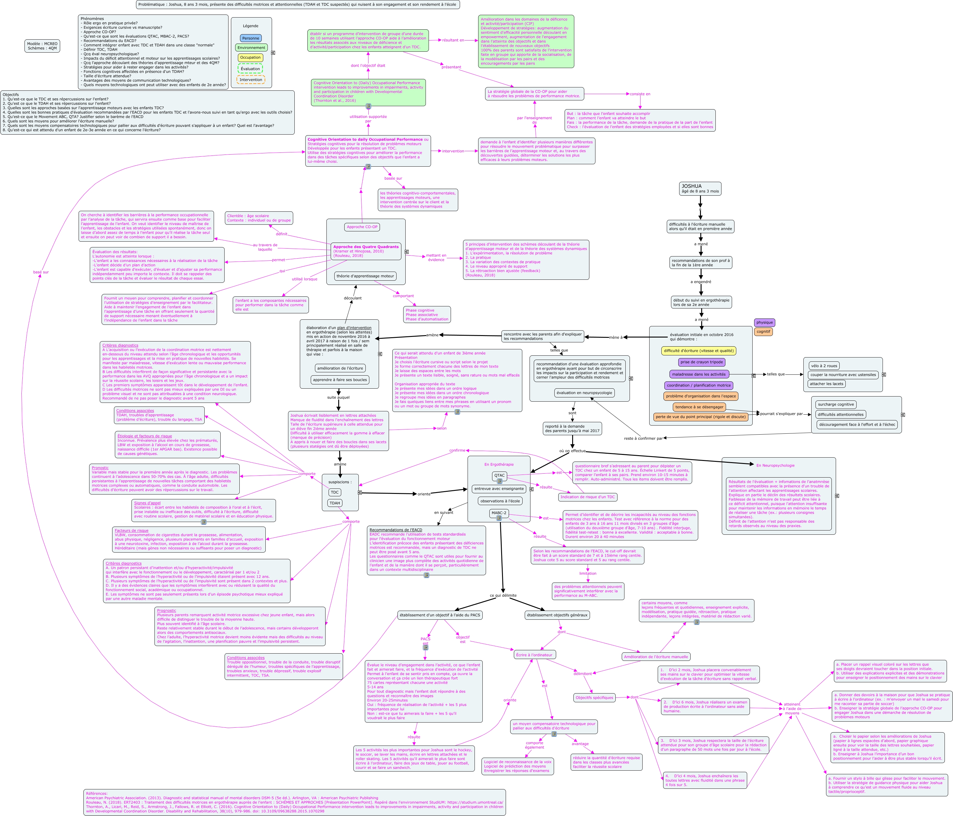 Cette carte de concepts créée avec IHMC CmapTools traite de: Groupe4_Vignette5_sarah, TDAH comporte Prognostic Plusieurs parents remarquent activité motrice excessive chez jeune enfant, mais alors difficile de distinguer le trouble de la moyenne haute. Plus souvent identifié à l’âge scolaire. Reste relativement stable durant le début de l’adolescence, mais certains développeront alors des comportements antisociaux. Chez l’adulte, l’hyperactivité motrice devient moins évidente mais des difficultés au niveau de l’agitation, l’inattention, une planification pauvre et l’impulsivité persistent., Approche des Quatre Quadrants (Kramer et Hinojosa, 2010) (Rouleau, 2018) permet Évaluation des résultats: L’autonomie est atteinte lorsque : -L’enfant a les connaissances nécessaires à la réalisation de la tâche -L’enfant décide d’un plan d’action -L’enfant est capable d’exécuter, d’évaluer et d’ajuster sa performance indépendamment peu importe le contexte. Il doit se rappeler des points clés de la tâche et évaluer le résultat de chaque essai., ???? reste à confirmer par évaluation en neuropsycologie, Approche des Quatre Quadrants (Kramer et Hinojosa, 2010) (Rouleau, 2018) au travers de laquelle On cherche à identifier les barrières à la performance occupationnelle par l’analyse de la tâche, qui servira ensuite comme base pour faciliter l’apprentissage de l’enfant. On veut identifier le niveau de maîtrise de l’enfant, les obstacles et les stratégies utilisées spontanément, donc on laisse d’abord assez de temps à l’enfant pour qu’il réalise la tâche seul et ensuite on peut voir de combien de support il a besoin., QTAC résulte Indication de risque d'un TDC, 1. D’ici 2 mois, Joshua placera convenablement ses mains sur le clavier pour optimiser la vitesse d’exécution de la tâche d’écriture sans rappel verbal. atteinent à l'aide de moyens a. Choisir le papier selon les améliorations de Joshua (papier à lignes espacées d’abord, papier graphique ensuite pour voir la taille des lettres souhaitées, papier ligné à la taille attendue, etc.) b. Enseigner à Joshua l’importance d’un bon positionnement pour l’aider à être plus stable lorsqu’il écrit., rencontre avec les parents afin d'expliquer les recommandations telles que ????, Joshua écrivait lisiblement en lettres attachées Manque de fluidité dans l'enchaînement des lettres Talle de l'écriture supérieure à celle attendue pour un élève fin 2ième année Difficulté à utiliser efficacement la gomme à effacer (manque de précision) A appris à nouer et faire des boucles dans ses lacets (plusieurs statégies ont dû être déployées) amène suspiscions :, TDC comporte Étiologie et facteurs de risque Inconnue. Prévalence plus élevée chez les prématurés, LBW et exposition à l’alcool en cours de grossesse, naissance difficile (1er APGAR bas). Existence possible de causes génétiques., Cognitive Orientation to daily Occupational Performance ou Stratégies cognitives pour la résolution de problèmes moteurs Développée pour les enfants présentant un TDC. Utilise des stratégies cognitives pour améliorer la performance dans des tâches spécifiques selon des objectifs que l’enfant a lui-même choisi. basée sur les théories cognitivo-comportementales, les apprentissages moteurs, une intervention centrée sur le client et la théorie des systèmes dynamiques, établissement objectifs généraux dont Amélioration de l’écriture manuelle, reporté à la demande des parents jusqu'à mai 2017 où on effectue En Neuropsychologie, Joshua écrivait lisiblement en lettres attachées Manque de fluidité dans l'enchaînement des lettres Talle de l'écriture supérieure à celle attendue pour un élève fin 2ième année Difficulté à utiliser efficacement la gomme à effacer (manque de précision) A appris à nouer et faire des boucles dans ses lacets (plusieurs statégies ont dû être déployées) selon Ce qui serait attendu d'un enfant de 3ième année Présentation Je choisis l’écriture cursive ou script selon le projet Je forme correctement chacune des lettres de mon texte Je laisse des espaces entre les mots Je présente un texte lisible, soigné, sans rature ou mots mal effacés Organisation appropriée du texte Je présente mes idées dans un ordre logique Je présente mes idées dans un ordre chronologique Je regroupe mes idées en paragraphes Je fais quelques liens entre mes phrases en utilisant un pronom ou un mot ou groupe de mots synonyme., Objecitfs spécifiques dont 4. D’ici 4 mois, Joshua enchaînera les toutes lettres avec fluidité dans une phrase 4 fois sur 5., 2. D’ici 6 mois, Joshua réalisera un examen de production écrite à l’ordinateur sans aide humaine. atteinent à l'aide de moyens a. Fournir un stylo à bille qui glisse pour faciliter le mouvement. b. Utiliser la stratégie de guidance physique pour aider Joshua à comprendre ce qu’est un mouvement fluide au niveau tactile/proprioceptif., élaboration d'un plan d'intervention en ergothérapie (selon les attentes) mis en action de novembre 2016 à avril 2017 à raison de 1 fois / sem principalement réalisé en salle de thérapie et parfois à la maison qui vise : découlant ????, ???? ce qui délimite établissement objectifs généraux, Objecitfs spécifiques dont 2. D’ici 6 mois, Joshua réalisera un examen de production écrite à l’ordinateur sans aide humaine., ???? ce qui délimite établissement d'un objectif à l'aide du PACS, MABC-2 est Permet d’identifier et de décrire les incapacités au niveau des fonctions motrices chez les enfants. Test avec référence à la norme pour des enfants de 3 ans à 16 ans 11 mois divisés en 3 groupes d’âge (utilisation du deuxième groupe d’âge, 7-10 ans) . Fidélité interjuge, fidélité test-retest : bonne à excellente. Validité : acceptable à bonne. Durent environ 20 à 40 minutes