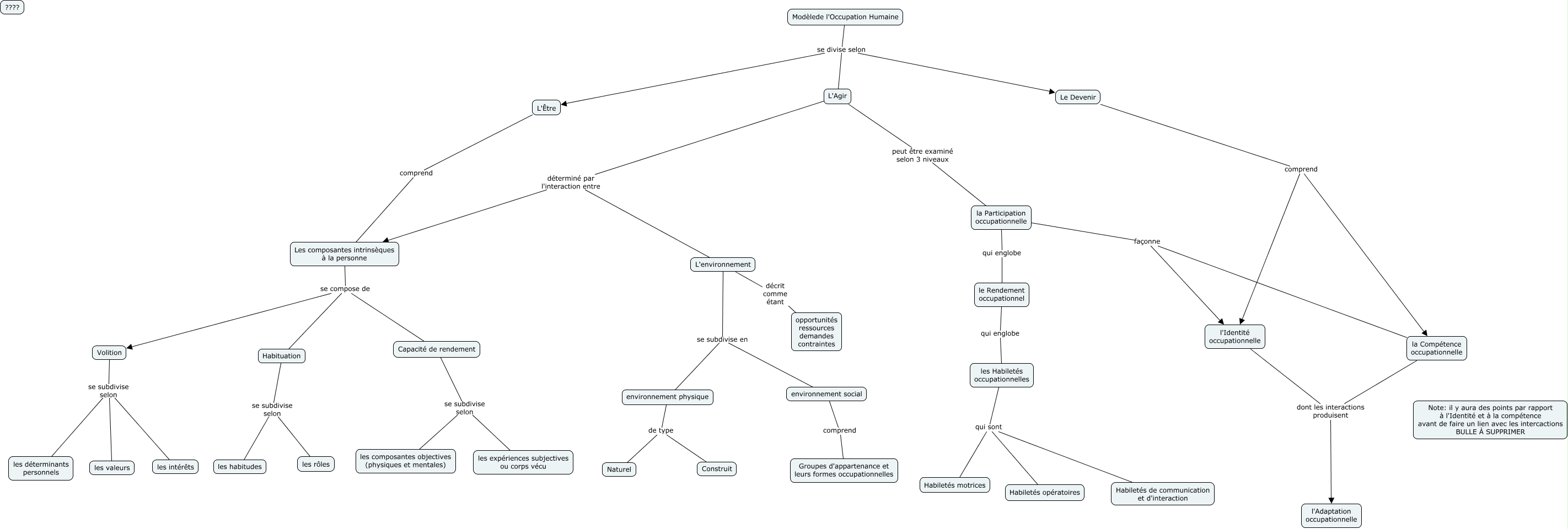 Cette carte de concepts créée avec IHMC CmapTools traite de: Structure pour le MOH, Capacité de rendement se subdivise selon les expériences subjectives ou corps vécu, les Habiletés occupationnelles qui sont Habiletés motrices, L'Agir déterminé par l'interaction entre Les composantes intrinsèques à la personne, environnement social comprend Groupes d'appartenance et leurs formes occupationnelles, environnement physique de type Construit, L'Être comprend Les composantes intrinsèques à la personne, L'Agir déterminé par l'interaction entre L'environnement, L'Agir peut être examiné selon 3 niveaux la Participation occupationnelle, Volition se subdivise selon les intérêts, les Habiletés occupationnelles qui sont Habiletés opératoires, Modèlede l'Occupation Humaine se divise selon L'Agir, Modèlede l'Occupation Humaine se divise selon L'Être, L'environnement décrit comme étant opportunités ressources demandes contraintes, Les composantes intrinsèques à la personne se compose de Volition, Le Devenir comprend la Compétence occupationnelle, Habituation se subdivise selon les rôles, Volition se subdivise selon les déterminants personnels, environnement physique de type Naturel, le Rendement occupationnel qui englobe les Habiletés occupationnelles, Les composantes intrinsèques à la personne se compose de Capacité de rendement