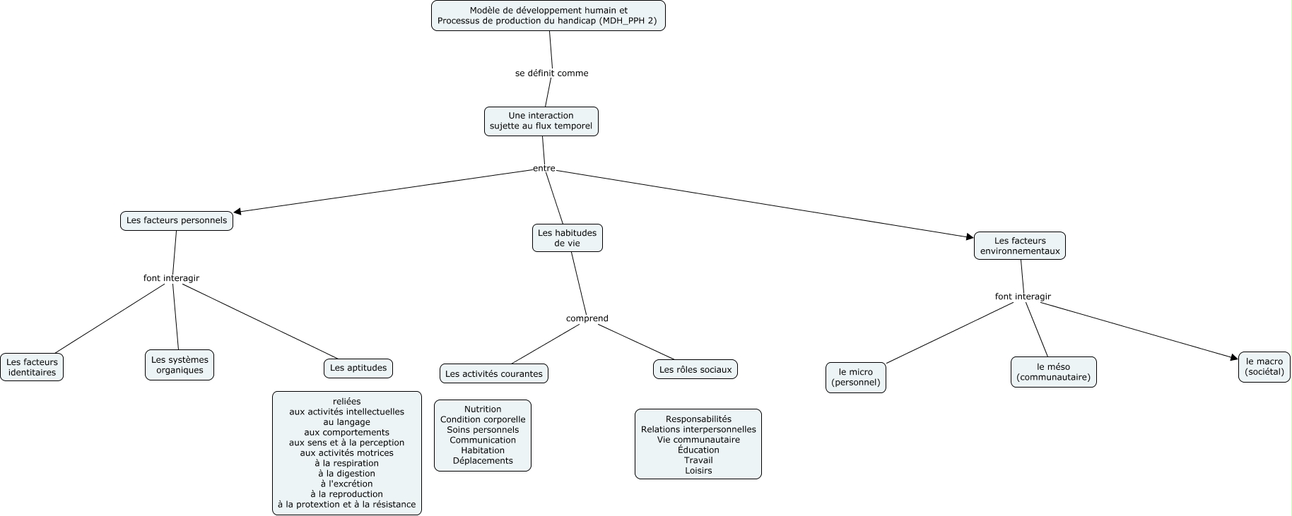 Cette carte de concepts créée avec IHMC CmapTools traite de: Structure MDH-PPH 2, Les facteurs environnementaux font interagir le micro (personnel), Les habitudes de vie comprend Les activités courantes, Les facteurs environnementaux font interagir le méso (communautaire), Modèle de développement humain et Processus de production du handicap (MDH_PPH 2) se définit comme Une interaction sujette au flux temporel, Les facteurs personnels font interagir Les facteurs identitaires, Les habitudes de vie comprend Les rôles sociaux, Une interaction sujette au flux temporel entre Les facteurs personnels, Les facteurs environnementaux font interagir le macro (sociétal), Une interaction sujette au flux temporel entre Les facteurs environnementaux, Les facteurs personnels font interagir Les systèmes organiques, Une interaction sujette au flux temporel entre Les habitudes de vie, Les facteurs personnels font interagir Les aptitudes