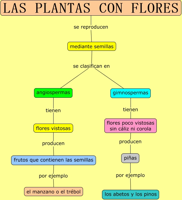 Este Cmap, tiene información relacionada con: Las plantas con flores, piñas por ejemplo los abetos y los pinos, flores poco vistosas sin cáliz ni corola producen piñas, flores vistosas producen frutos que contienen las semillas, mediante semillas se clasifican en angiospermas, frutos que contienen las semillas por ejemplo el manzano o el trébol, angiospermas tienen flores vistosas, mediante semillas se clasifican en gimnospermas, LAS PLANTAS CON FLORES se reproducen mediante semillas, gimnospermas tienen flores poco vistosas sin cáliz ni corola