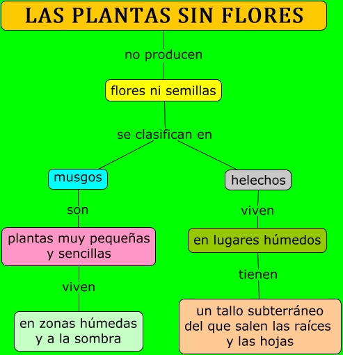 Este Cmap, tiene información relacionada con: Las plantas sin flores, musgos son plantas muy pequeñas y sencillas, flores ni semillas se clasifican en musgos, en lugares húmedos tienen un tallo subterráneo del que salen las raíces y las hojas, helechos viven en lugares húmedos, flores ni semillas se clasifican en helechos, LAS PLANTAS SIN FLORES no producen flores ni semillas, plantas muy pequeñas y sencillas viven en zonas húmedas y a la sombra