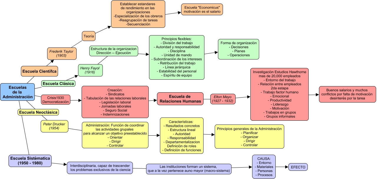 Este Cmap, tiene información relacionada con: APV_U1_S2_A2_JANM, Escuelas de la Administración Escuela Científca Frederik Taylor (1903), Interdisciplinaria, capaz de trascender los problemas exclusivos de la ciencia Las instituciones forman un sistema, que a la vez pertenece auno mayor (macro-sistema) CAUSA: - Entorno - Materiales - Personas - Procesos, Henry Fayol (1916) Estructura de la organizacion Dirección -- Ejecución Principios flexibles: - División del trabajo - Autoridad y responsabilidad - Disciplina - Unidad de mando - Subordinación de los intereses - Retribución del trabajo - Línea jerárquica - Estabilidad del personal - Espíritu de equipo, Escuelas de la Administración Escuela Clásica Henry Fayol (1916), CAUSA: - Entorno - Materiales - Personas - Procesos ???? EFECTO, Escuelas de la Administración Crisis1930 Democratización Creación: - Sindicatos - Tabulación de las relaciones laborales - Legislación laboral - Jornadas laborales - Seguro Social - Indemnizaciones, Principios flexibles: - División del trabajo - Autoridad y responsabilidad - Disciplina - Unidad de mando - Subordinación de los intereses - Retribución del trabajo - Línea jerárquica - Estabilidad del personal - Espíritu de equipo ???? Forma de organización - Decisiones - Planes - Operaciones, Peter Drucker (1954) Administración: Función de coordinar las actividades grupales para alcanzar un objetivo preestablecido - Orientar - Dirigir - Controlar Características: - Resultados concretos - Estructura lineal - Autoridad - Responsabilidad - Departamentalizacion Definición de roles - Definición de funciones, Establecer estandares de rendimiento en las organizaciones -Especialización de los obreros -Reagrupación de tareas -Secuenciación ???? Escuela "Economicus" motivación es el salario, Escuelas de la Administración Escuela Neoclásica Peter Drucker (1954), Investigación Estudios Hawthorne mas de 20,000 empleados - Entorno del trabajo - Relación entre empleados 2da estapa - Trabajo factor humano - Emocional - Productividad - Liderazgo - Motivación - Trabajos en grupos - Grupos informales ???? Buenos salarios y muchos conflictos por falta de motivación desinterés por la tarea, Creación: - Sindicatos - Tabulación de las relaciones laborales - Legislación laboral - Jornadas laborales - Seguro Social - Indemnizaciones ???? Escuela de Relaciones Humanas, Frederik Taylor (1903) Teoría Establecer estandares de rendimiento en las organizaciones -Especialización de los obreros -Reagrupación de tareas -Secuenciación, Características: - Resultados concretos - Estructura lineal - Autoridad - Responsabilidad - Departamentalizacion Definición de roles - Definición de funciones ???? Principios generales de la Administración - Planificar - Organizar - Dirigir - Controlar, Escuela de Relaciones Humanas Elton Mayo (1927 - 1932) Investigación Estudios Hawthorne mas de 20,000 empleados - Entorno del trabajo - Relación entre empleados 2da estapa - Trabajo factor humano - Emocional - Productividad - Liderazgo - Motivación - Trabajos en grupos - Grupos informales, Escuelas de la Administración Escuela Sistématica (1950 - 1980) Interdisciplinaria, capaz de trascender los problemas exclusivos de la ciencia