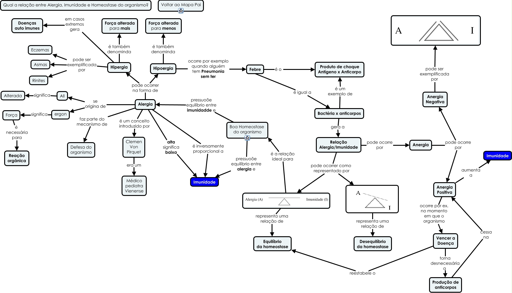 Esse mapa conceitual, produzido no IHMC CmapTools, tem a informação relacionada a: Qual a relação entre Alergia, Imunidade e Homeostase do organismo, Relação Alergia/Imunidade pode ocorre por Anergia, é a relação ideal para Boa Homeostase do organismo, Clemen Von Pirquet era um Médico pediatra Vienense, Hipergia em casos extremos gera Doenças auto imunes, representa uma relação de Desequilíbrio da homeostase, Hipergia pode ser exemplificada por Rinites, Hipergia pode ser exemplificada por Eczemas, Anergia Positiva aumenta a Imunidade, Alergia faz parte do mecanismo de Defesa do organismo, Alergia pode ocorrer na forma de Hipoergia, Febre é o Produto de choque Antígeno x Anticorpo, Anergia Negativa pode ser exemplificada por, Alergia se origina de ergon, Alergia é inversamente proporcional a Imunidade, Hipoergia ocorre por exemplo quando alguém tem Pneumonia sem ter Febre, Bactéria x anticorpos gera a Relação Alergia/Imunidade, Febre é igual a Bactéria x anticorpos, Hipergia pode ser exemplificada por Asmas, Força é necessária para Reação orgânica, Alergia pode ocorrer na forma de Hipergia