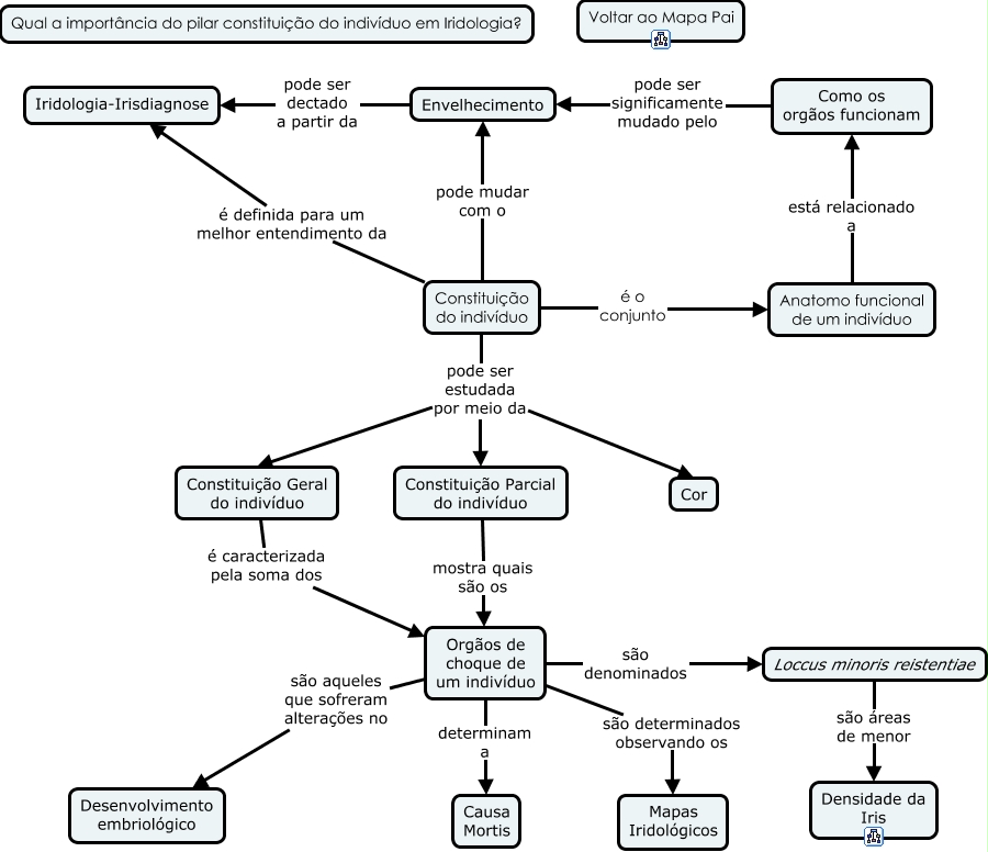 Esse mapa conceitual, produzido no IHMC CmapTools, tem a informação relacionada a: Qual a importância do Pilar constituição do indivíduo, Constituição Parcial do indivíduo mostra quais são os Orgãos de choque de um indivíduo, Constituição do indivíduo pode ser estudada por meio da Cor, Constituição do indivíduo pode ser estudada por meio da Constituição Parcial do indivíduo, Constituição do indivíduo é definida para um melhor entendimento da Iridologia-Irisdiagnose, Orgãos de choque de um indivíduo determinam a Causa Mortis, Orgãos de choque de um indivíduo são aqueles que sofreram alterações no Desenvolvimento embriológico, Constituição do indivíduo pode mudar com o Envelhecimento, Envelhecimento pode ser dectado a partir da Iridologia-Irisdiagnose, Anatomo funcional de um indivíduo está relacionado a Como os orgãos funcionam, Constituição do indivíduo pode ser estudada por meio da Constituição Geral do indivíduo, Como os orgãos funcionam pode ser significamente mudado pelo Envelhecimento, Orgãos de choque de um indivíduo são denominados Loccus minoris reistentiae, Constituição do indivíduo é o conjunto Anatomo funcional de um indivíduo, Orgãos de choque de um indivíduo são determinados observando os Mapas Iridológicos, Constituição Geral do indivíduo é caracterizada pela soma dos Orgãos de choque de um indivíduo, Loccus minoris reistentiae são áreas de menor Densidade da Iris