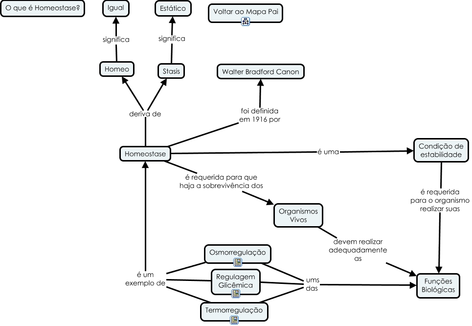 Esse mapa conceitual, produzido no IHMC CmapTools, tem a informação relacionada a: O que é Homeostase, Homeo significa Igual, Termorregulação é um exemplo de Homeostase, Homeostase foi definida em 1916 por Walter Bradford Canon, Organismos Vivos devem realizar adequadamente as Funções Biológicas, Stasis significa Estático, Homeostase é uma Condição de estabilidade, Regulagem Glicêmica ums das Funções Biológicas, Homeostase é requerida para que haja a sobrevivência dos Organismos Vivos, Osmorregulação ums das Funções Biológicas, Regulagem Glicêmica é um exemplo de Homeostase, Termorregulação ums das Funções Biológicas, Homeostase deriva de Stasis, Condição de estabilidade é requerida para o organismo realizar suas Funções Biológicas, Osmorregulação é um exemplo de Homeostase, Homeostase deriva de Homeo