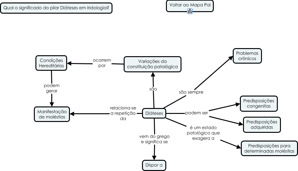 Esse mapa conceitual, produzido no IHMC CmapTools, tem a informação relacionada a: Qual o significado do pilar Diátese em Iridologia, Diáteses é um estado patológico que exagera a Predisposições para determinadas moléstias, Condições Hereditárias podem gerar Manifestação de moléstias, Diáteses vem do grego e significa se Dispor a, Diáteses relaciona-se a repetição da Manifestação de moléstias, Diáteses podem ser Predisposições congenitas, Diáteses podem ser Predisposições adquiridas, Variações da constituição patológica ocorrem por Condições Hereditárias, Diáteses são Variações da constituição patológica, Diáteses são sempre Problemas crônicos