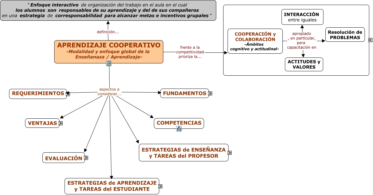 Este Cmap, tiene información relacionada con: APRENDIZAJE COOPERATIVO, COOPERACIÓN y COLABORACIÓN -Ámbitos cognitivo y actitudinal- apropiado , en particular, para capacitación en ACTITUDES y VALORES, REQUERIMIENTOS como p.e. CONSTANCIA y PACIENCIA -Fases Iniciales-, ESTRATEGIAS de ENSEÑANZA y TAREAS del PROFESOR -Organizar, promover y monitorizar- como... OBSERVADOR, EVALUACIÓN procedimientos... Evaluación Presentación, APRENDIZAJE COOPERATIVO -Modalidad y enfoque global de la Enseñanaza / Aprendizaje- definición... "Enfoque interactivo de organización del trabajo en el aula en el cual los alumnos son responsables de su aprendizaje y del de sus compañeros en una estrategia de corresponsabilidad para alcanzar metas e incentivos grupales", COOPERACIÓN y COLABORACIÓN -Ámbitos cognitivo y actitudinal- apropiado , en particular, para capacitación en Resolución de PROBLEMAS, ESTRATEGIAS de ENSEÑANZA y TAREAS del PROFESOR -Organizar, promover y monitorizar- como... MODELO, VENTAJAS favorece... Grado de COMPRENSIÓN - QUÉ, CÓMO, POR QUÉ-, APRENDIZAJE COOPERATIVO -Modalidad y enfoque global de la Enseñanaza / Aprendizaje- aspectos a considerar... REQUERIMIENTOS, VENTAJAS favorece... Aprendizaje COMPETENCIAS SOCIALES, VENTAJAS favorece... VOLUMEN de TRABAJO realizado, APRENDIZAJE COOPERATIVO -Modalidad y enfoque global de la Enseñanaza / Aprendizaje- aspectos a considerar... ESTRATEGIAS de APRENDIZAJE y TAREAS del ESTUDIANTE, ESTRATEGIAS de ENSEÑANZA y TAREAS del PROFESOR -Organizar, promover y monitorizar- como... REGULADOR de CONFLICTOS, FUNDAMENTOS responsabilidades y habilidades EVALUACIÓN de los RESULTADOS y del PROCESO, APRENDIZAJE COOPERATIVO -Modalidad y enfoque global de la Enseñanaza / Aprendizaje- aspectos a considerar... FUNDAMENTOS, FUNDAMENTOS responsabilidades y habilidades INTERACCIÓN F2F - P2P, REQUERIMIENTOS como p.e. PARTICIPACIÓN MUY ACTIVA, APRENDIZAJE COOPERATIVO -Modalidad y enfoque global de la Enseñanaza / Aprendizaje- aspectos a considerar... EVALUACIÓN, ESTRATEGIAS de APRENDIZAJE y TAREAS del ESTUDIANTE tales como... EMOCIONALES 'Autoapoyo', ESTRATEGIAS de APRENDIZAJE y TAREAS del ESTUDIANTE tales como... COGNITIVAS 'Proceso eficaz de la Información'