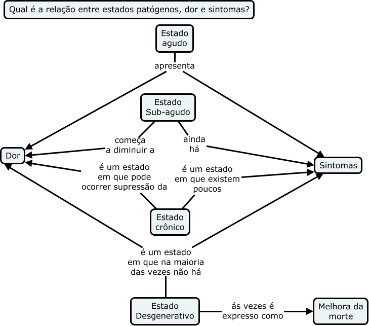 Esse mapa conceitual, produzido no IHMC CmapTools, tem a informação relacionada a: Qual é a relação entre estados patógenos, dor e sintomas, Estado crônico é um estado em que pode ocorrer supressão da Dor, Estado Desgenerativo é um estado em que na maioria das vezes não há Sintomas, Estado agudo apresenta Dor, Estado Sub-agudo começa a diminuir a Dor, Estado Desgenerativo ás vezes é expresso como Melhora da morte, Estado crônico é um estado em que existem poucos Sintomas, Estado Desgenerativo é um estado em que na maioria das vezes não há Dor, Estado Sub-agudo ainda há Sintomas, Estado agudo apresenta Sintomas