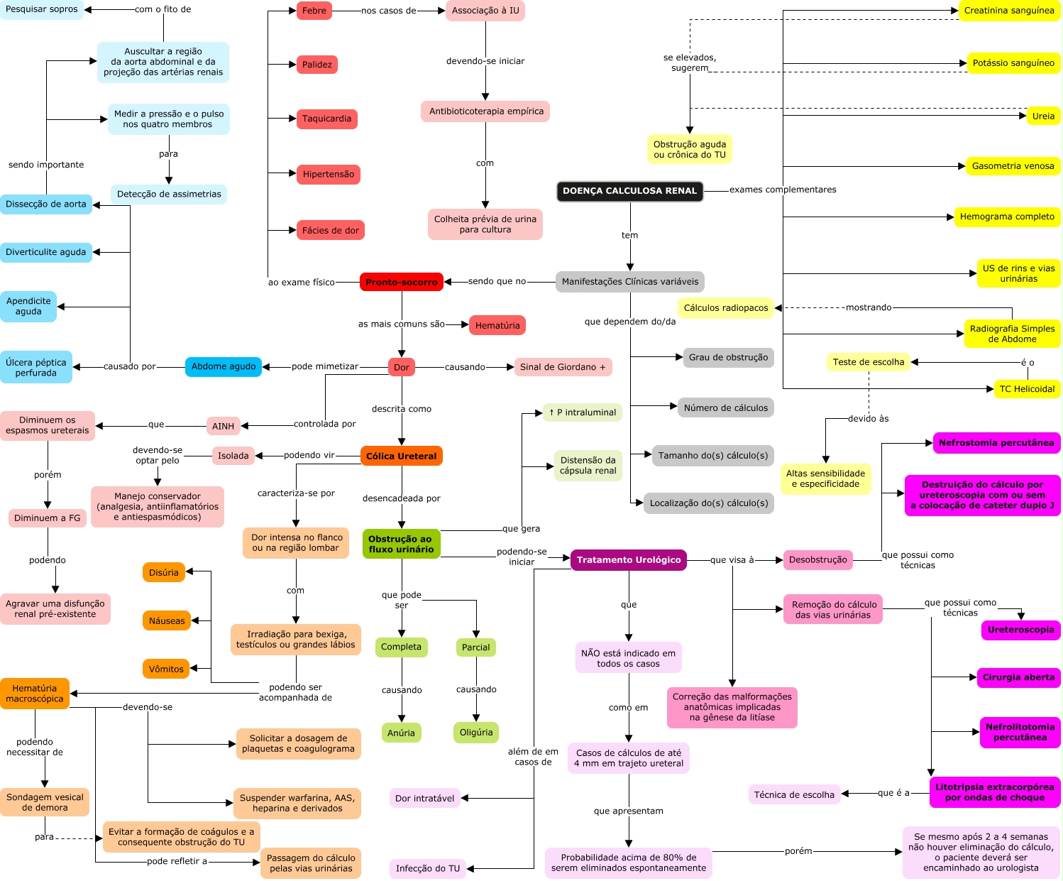 Esse mapa conceitual, produzido no IHMC CmapTools, tem a informação relacionada a: Litíase Renal, Hematúria macroscópica devendo-se Suspender warfarina, AAS, heparina e derivados, Obstrução ao fluxo urinário que gera ↑ P intraluminal, DOENÇA CALCULOSA RENAL exames complementares Hemograma completo, NÃO está indicado em todos os casos como em Casos de cálculos de até 4 mm em trajeto ureteral, Medir a pressão e o pulso nos quatro membros para Detecção de assimetrias, Pronto-socorro ao exame físico Palidez, Obstrução ao fluxo urinário que pode ser Parcial, Hematúria macroscópica pode refletir a Passagem do cálculo pelas vias urinárias, Pronto-socorro ao exame físico Taquicardia, Tratamento Urológico além de em casos de Infecção do TU, Desobstrução que possui como técnicas Nefrostomia percutânea, Casos de cálculos de até 4 mm em trajeto ureteral que apresentam Probabilidade acima de 80% de serem eliminados espontaneamente, Dor descrita como Cólica Ureteral, Dor controlada por AINH, Antibioticoterapia empírica com Colheita prévia de urina para cultura, DOENÇA CALCULOSA RENAL exames complementares Gasometria venosa, Irradiação para bexiga, testículos ou grandes lábios podendo ser acompanhada de Disúria, Tratamento Urológico que visa à Remoção do cálculo das vias urinárias, Tratamento Urológico que NÃO está indicado em todos os casos, Ureia se elevados, sugerem Obstrução aguda ou crônica do TU