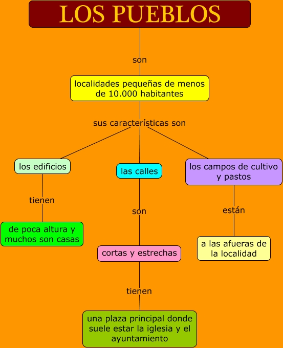 Este Cmap, tiene información relacionada con: Los pueblos, los edificios tienen de poca altura y muchos son casas, cortas y estrechas tienen una plaza principal donde suele estar la iglesia y el ayuntamiento, los campos de cultivo y pastos están a las afueras de la localidad, localidades pequeñas de menos de 10.000 habitantes sus características son los edificios, localidades pequeñas de menos de 10.000 habitantes sus características son los campos de cultivo y pastos, LOS PUEBLOS son localidades pequeñas de menos de 10.000 habitantes, localidades pequeñas de menos de 10.000 habitantes sus características son las calles, las calles son cortas y estrechas