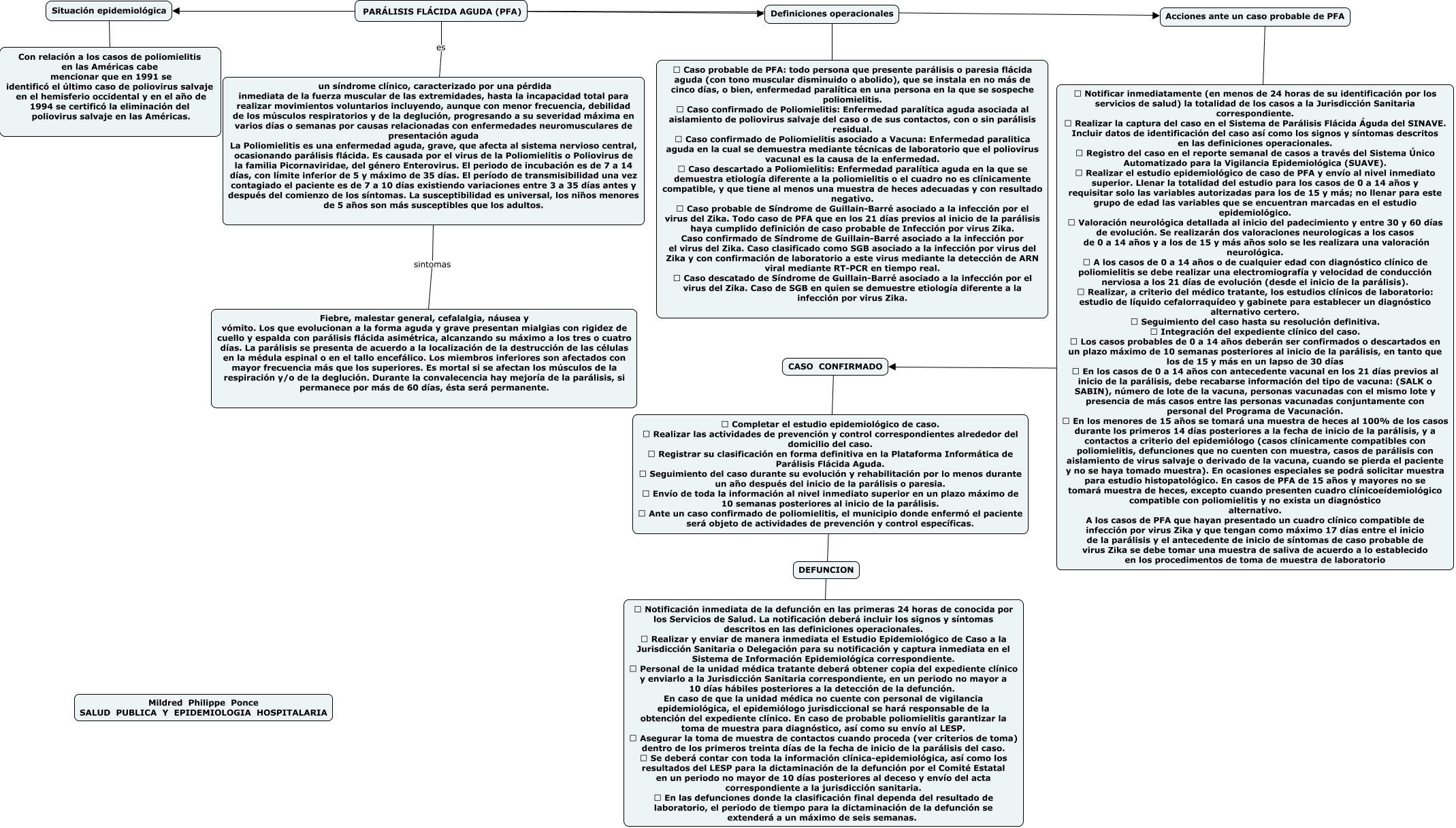 Este Cmap, tiene información relacionada con: PARALISIS FLACIDA, Completar el estudio epidemiológico de caso. Realizar las actividades de prevención y control correspondientes alrededor del domicilio del caso. Registrar su clasificación en forma definitiva en la Plataforma Informática de Parálisis Flácida Aguda. Seguimiento del caso durante su evolución y rehabilitación por lo menos durante un año después del inicio de la parálisis o paresia. Envío de toda la información al nivel inmediato superior en un plazo máximo de 10 semanas posteriores al inicio de la parálisis. Ante un caso confirmado de poliomielitis, el municipio donde enfermó el paciente será objeto de actividades de prevención y control específicas. ???? DEFUNCION, PARÁLISIS FLÁCIDA AGUDA (PFA) ???? Definiciones operacionales, Acciones ante un caso probable de PFA ???? Notificar inmediatamente (en menos de 24 horas de su identificación por los servicios de salud) la totalidad de los casos a la Jurisdicción Sanitaria correspondiente. Realizar la captura del caso en el Sistema de Parálisis Flácida Águda del SINAVE. Incluir datos de identificación del caso así como los signos y síntomas descritos en las definiciones operacionales. Registro del caso en el reporte semanal de casos a través del Sistema Único Automatizado para la Vigilancia Epidemiológica (SUAVE). Realizar el estudio epidemiológico de caso de PFA y envío al nivel inmediato superior. Llenar la totalidad del estudio para los casos de 0 a 14 años y requisitar solo las variables autorizadas para los de 15 y más; no llenar para este grupo de edad las variables que se encuentran marcadas en el estudio epidemiológico. Valoración neurológica detallada al inicio del padecimiento y entre 30 y 60 días de evolución. Se realizarán dos valoraciones neurologicas a los casos de 0 a 14 años y a los de 15 y más años solo se les realizara una valoración neurológica. A los casos de 0 a 14 años o de cualquier edad con diagnóstico clínico de poliomielitis se debe realizar una electromiografía y velocidad de conducción nerviosa a los 21 días de evolución (desde el inicio de la parálisis). Realizar, a criterio del médico tratante, los estudios clínicos de laboratorio: estudio de líquido cefalorraquídeo y gabinete para establecer un diagnóstico alternativo certero. Seguimiento del caso hasta su resolución definitiva. Integración del expediente clínico del caso. Los casos probables de 0 a 14 años deberán ser confirmados o descartados en un plazo máximo de 10 semanas posteriores al inicio de la parálisis, en tanto que los de 15 y más en un lapso de 30 días En los casos de 0 a 14 años con antecedente vacunal en los 21 días previos al inicio de la parálisis, debe recabarse información del tipo de vacuna: (SALK o SABIN), número de lote de la vacuna, personas vacunadas con el mismo lote y presencia de más casos entre las personas vacunadas conjuntamente con personal del Programa de Vacunación. En los menores de 15 años se tomará una muestra de heces al 100% de los casos durante los primeros 14 días posteriores a la fecha de inicio de la parálisis, y a contactos a criterio del epidemiólogo (casos clínicamente compatibles con poliomielitis, defunciones que no cuenten con muestra, casos de parálisis con aislamiento de virus salvaje o derivado de la vacuna, cuando se pierda el paciente y no se haya tomado muestra). En ocasiones especiales se podrá solicitar muestra para estudio histopatológico. En casos de PFA de 15 años y mayores no se tomará muestra de heces, excepto cuando presenten cuadro clínicoeídemiológico compatible con poliomielitis y no exista un diagnóstico alternativo. A los casos de PFA que hayan presentado un cuadro clínico compatible de infección por virus Zika y que tengan como máximo 17 días entre el inicio de la parálisis y el antecedente de inicio de síntomas de caso probable de virus Zika se debe tomar una muestra de saliva de acuerdo a lo establecido en los procedimentos de toma de muestra de laboratorio, Situación epidemiológica ???? Con relación a los casos de poliomielitis en las Américas cabe mencionar que en 1991 se identificó el último caso de poliovirus salvaje en el hemisferio occidental y en el año de 1994 se certificó la eliminación del poliovirus salvaje en las Américas., PARÁLISIS FLÁCIDA AGUDA (PFA) es un síndrome clínico, caracterizado por una pérdida inmediata de la fuerza muscular de las extremidades, hasta la incapacidad total para realizar movimientos voluntarios incluyendo, aunque con menor frecuencia, debilidad de los músculos respiratorios y de la deglución, progresando a su severidad máxima en varios días o semanas por causas relacionadas con enfermedades neuromusculares de presentación aguda La Poliomielitis es una enfermedad aguda, grave, que afecta al sistema nervioso central, ocasionando parálisis flácida. Es causada por el virus de la Poliomielitis o Poliovirus de la familia Picornaviridae, del género Enterovirus. El periodo de incubación es de 7 a 14 días, con límite inferior de 5 y máximo de 35 días. El período de transmisibilidad una vez contagiado el paciente es de 7 a 10 días existiendo variaciones entre 3 a 35 días antes y después del comienzo de los síntomas. La susceptibilidad es universal, los niños menores de 5 años son más susceptibles que los adultos., CASO CONFIRMADO ???? Completar el estudio epidemiológico de caso. Realizar las actividades de prevención y control correspondientes alrededor del domicilio del caso. Registrar su clasificación en forma definitiva en la Plataforma Informática de Parálisis Flácida Aguda. Seguimiento del caso durante su evolución y rehabilitación por lo menos durante un año después del inicio de la parálisis o paresia. Envío de toda la información al nivel inmediato superior en un plazo máximo de 10 semanas posteriores al inicio de la parálisis. Ante un caso confirma
