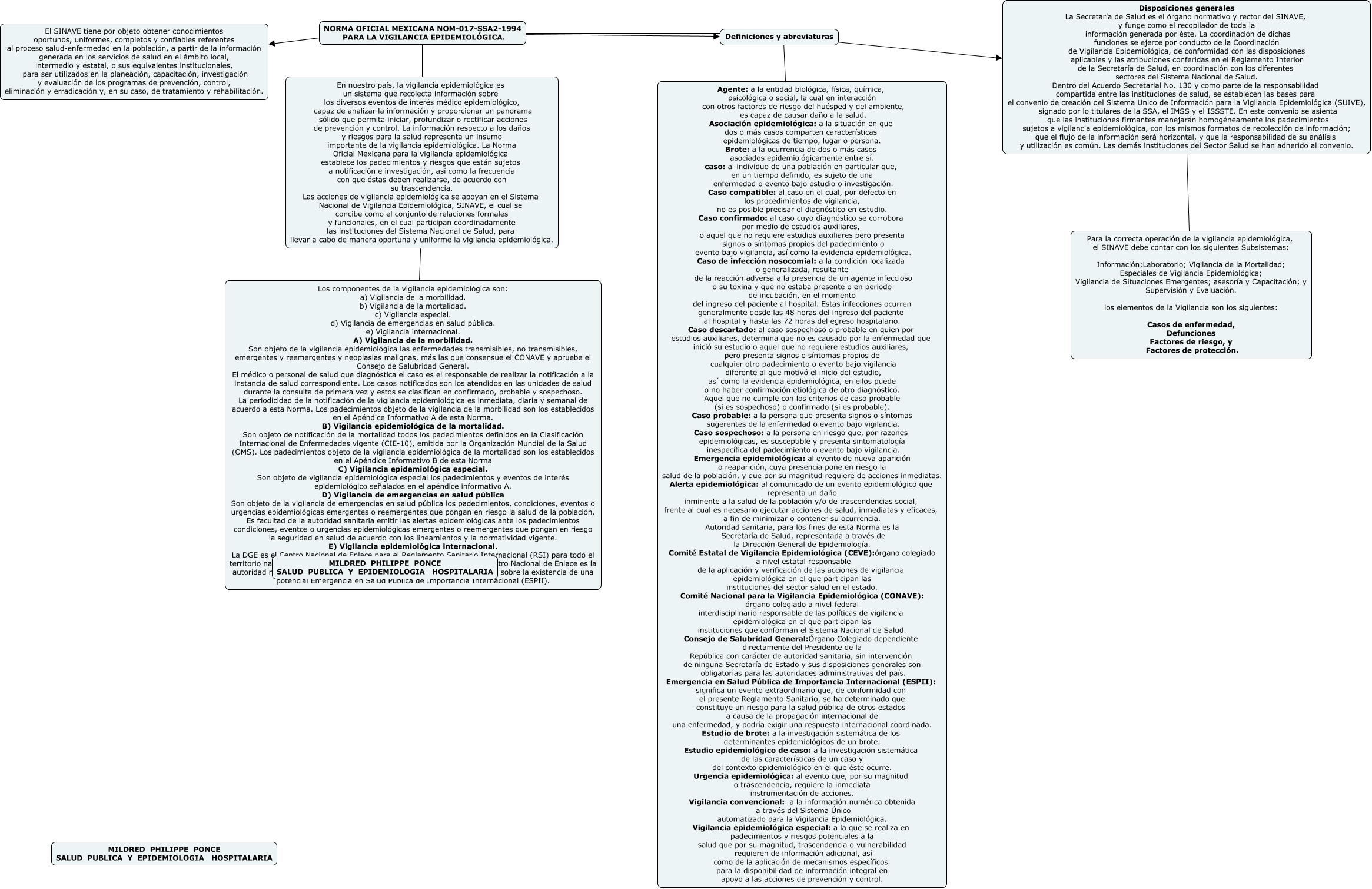 Este Cmap, tiene información relacionada con: vigilancia epidemiologica, MILDRED PHILIPPE PONCE SALUD PUBLICA Y EPIDEMIOLOGIA HOSPITALARIA ???? Los componentes de la vigilancia epidemiológica son: a) Vigilancia de la morbilidad. b) Vigilancia de la mortalidad. c) Vigilancia especial. d) Vigilancia de emergencias en salud pública. e) Vigilancia internacional. A) Vigilancia de la morbilidad. Son objeto de la vigilancia epidemiológica las enfermedades transmisibles, no transmisibles, emergentes y reemergentes y neoplasias malignas, más las que consensue el CONAVE y apruebe el Consejo de Salubridad General. El médico o personal de salud que diagnóstica el caso es el responsable de realizar la notificación a la instancia de salud correspondiente. Los casos notificados son los atendidos en las unidades de salud durante la consulta de primera vez y estos se clasifican en confirmado, probable y sospechoso. La periodicidad de la notificación de la vigilancia epidemiológica es inmediata, diaria y semanal de acuerdo a esta Norma. Los padecimientos objeto de la vigilancia de la morbilidad son los establecidos en el Apéndice Informativo A de esta Norma. B) Vigilancia epidemiológica de la mortalidad. Son objeto de notificación de la mortalidad todos los padecimientos definidos en la Clasificación Internacional de Enfermedades vigente (CIE-10), emitida por la Organización Mundial de la Salud (OMS). Los padecimientos objeto de la vigilancia epidemiológica de la mortalidad son los establecidos en el Apéndice Informativo B de esta Norma C) Vigilancia epidemiológica especial. Son objeto de vigilancia epidemiológica especial los padecimientos y eventos de interés epidemiológico señalados en el apéndice informativo A. D) Vigilancia de emergencias en salud pública Son objeto de la vigilancia de emergencias en salud pública los padecimientos, condiciones, eventos o urgencias epidemiológicas emergentes o reemergentes que pongan en riesgo la salud de la población. Es facultad de la autoridad sanitaria emitir las alertas epidemiológicas ante los padecimientos condiciones, eventos o urgencias epidemiológicas emergentes o reemergentes que pongan en riesgo la seguridad en salud de acuerdo con los lineamientos y la normatividad vigente. E) Vigilancia epidemiológica internacional. La DGE es el Centro Nacional de Enlace para el Reglamento Sanitario Internacional (RSI) para todo el territorio nacional y todas las instituciones dentro y fuera del sector. El Centro Nacional de Enlace es la autoridad nacional responsable de notificar a las instancias internacionales sobre la existencia de una potencial Emergencia en Salud Pública de Importancia Internacional (ESPII)., Definiciones y abreviaturas ???? Agente: a la entidad biológica, física, química, psicológica o social, la cual en interacción con otros factores de riesgo del huésped y del ambiente, es capaz de causar daño a la salud. Asociación epidemiológica: a la situación en que dos o más casos comparten características epidemiológicas de tiempo, lugar o persona. Brote: a la ocurrencia de dos o más casos asociados epidemiológicamente entre sí. caso: al individuo de una población en particular que, en un tiempo definido, es sujeto de una enfermedad o evento bajo estudio o investigación. Caso compatible: al caso en el cual, por defecto en los procedimientos de vigilancia, no es posible precisar el diagnóstico en estudio. Caso confirmado: al caso cuyo diagnóstico se corrobora por medio de estudios auxiliares, o aquel que no requiere estudios auxiliares pero presenta signos o síntomas propios del padecimiento o evento bajo vigilancia, así como la evidencia epidemiológica. Caso de infección nosocomial: a la condición localizada o generalizada, resultante de la reacción adversa a la presencia de un agente infeccioso o su toxina y que no estaba presente o en periodo de incubación, en el momento del ingreso del paciente al hospital. Estas infecciones ocurren generalmente desde las 48 horas del ingreso del paciente al hospital y hasta las 72 horas del egreso hospitalario. Caso descartado: al caso sospechoso o probable en quien por estudios auxiliares, determina que no es causado por la enfermedad que inició su estudio o aquel que no requiere estudios auxiliares, pero presenta signos o síntomas propios de cualquier otro padecimiento o evento bajo vigilancia diferente al que motivó el inicio del estudio, así como la evidencia epidemiológica, en ellos puede o no haber confirmación etiológica de otro diagnóstico. Aquel que no cumple con los criterios de caso probable (si es sospechoso) o confirmado (si es probable). Caso probable: a la persona que presenta signos o síntomas sugerentes de la enfermedad o evento bajo vigilancia. Caso sospechoso: a la persona en riesgo que, por razones epidemiológicas, es susceptible y presenta sintomatología inespecífica del padecimiento o evento bajo vigilancia. Emergencia epidemiológica: al evento de nueva aparición o reaparición, cuya presencia pone en riesgo la salud de la población, y que por su magnitud requiere de acciones inmediatas. Alerta epidemiológica: al comunicado de un evento epidemiológico que representa un daño inminente a la salud de la población y/o de trascendencias social, frente al cual es necesario ejecutar acciones de salud, inmediatas y eficaces, a fin de minimizar o contener su ocurrencia. Autoridad sanitaria, para los fines de esta Norma es la Secretaría de Salud, representada a través de la Dirección General de Epidemiología. Comité Estatal de Vigilancia Epidemiológica (CEVE):órgano colegiado a nivel estatal responsable de la aplicación y verificación de las acciones de vigilancia epidemiológica en el que participan las instituciones del sector salud en el estado. Comité Nacional para la Vigilancia Epidemiológica (CONAVE): órgano colegiado a nivel federal interdisciplinario responsable de las políticas de vigilancia epidemiológica e