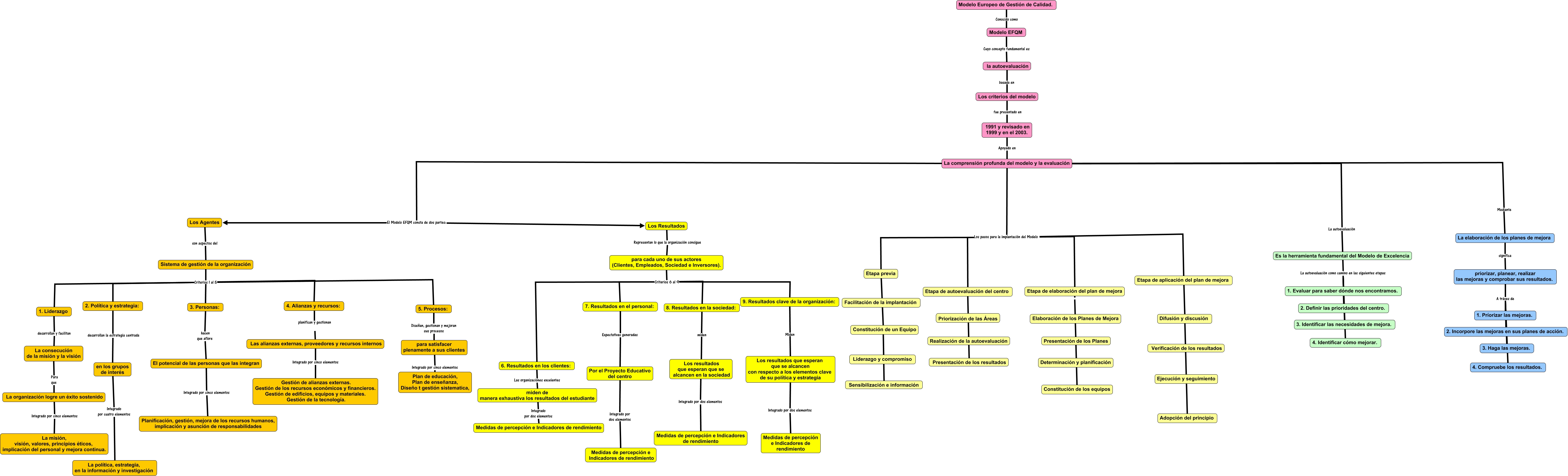 Este Cmap, tiene información relacionada con: EFQM, La comprensión profunda del modelo y la evaluación El Modelo EFQM consta de dos partes: Los Resultados, Los Agentes son aspectos del Sistema de gestión de la organización, priorizar, planear, realizar las mejoras y comprobar sus resultados. A tráves de 4. Compruebe los resultados., miden de manera exhaustiva los resultados del estudiante Integrado por dos elementos Medidas de percepción e Indicadores de rendimiento, Etapa de aplicación del plan de mejora ???? Adopción del principio, 9. Resultados clave de la organización: Miden Los resultados que esperan que se alcancen con respecto a los elementos clave de su política y estrategia, Etapa de elaboración del plan de mejora Constitución de los equipos, Es la herramienta fundamental del Modelo de Excelencia La autoevaluación como camino en las siguientes etapas 1. Evaluar para saber dónde nos encontramos., Sistema de gestión de la organización Criterios 1 al 5 1. Liderazgo, La consecución de la misión y la visión Para que La organización logre un éxito sostenido, El potencial de las personas que las integran Integrado por cinco elementos Planificación, gestión, mejora de los recursos humanos, implicación y asunción de responsabilidades, 5. Procesos: Diseñan, gestionan y mejoran sus procesos para satisfacer plenamente a sus clientes, 4. Alianzas y recursos: planifican y gestionan Las alianzas externas, proveedores y recursos internos, 6. Resultados en los clientes: Las organizaciones excelentes miden de manera exhaustiva los resultados del estudiante, priorizar, planear, realizar las mejoras y comprobar sus resultados. A tráves de 3. Haga las mejoras., La comprensión profunda del modelo y la evaluación El Modelo EFQM consta de dos partes: Los Agentes, La comprensión profunda del modelo y la evaluación Los pasos para la implantación del Modelo Etapa de elaboración del plan de mejora, Los resultados que esperan que se alcancen con respecto a los elementos clave de su política y estrategia Integrado por dos elementos Medidas de percepción e Indicadores de rendimiento, para cada uno de sus actores (Clientes, Empleados, Sociedad e Inversores). Criterios 6 al 9 6. Resultados en los clientes:, 1991 y revisado en 1999 y en el 2003. Apoyado en La comprensión profunda del modelo y la evaluación