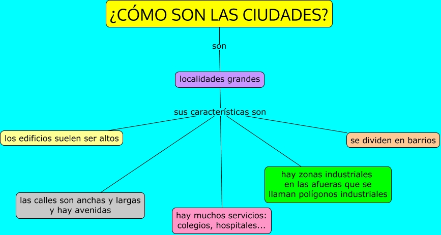 Este Cmap, tiene información relacionada con: Cómo son las ciudades, localidades grandes sus características son los edificios suelen ser altos, localidades grandes sus características son hay zonas industriales en las afueras que se llaman polígonos industriales, localidades grandes sus características son hay muchos servicios: colegios, hospitales..., localidades grandes sus características son las calles son anchas y largas y hay avenidas, localidades grandes sus características son se dividen en barrios, ¿CÓMO SON LAS CIUDADES? son localidades grandes