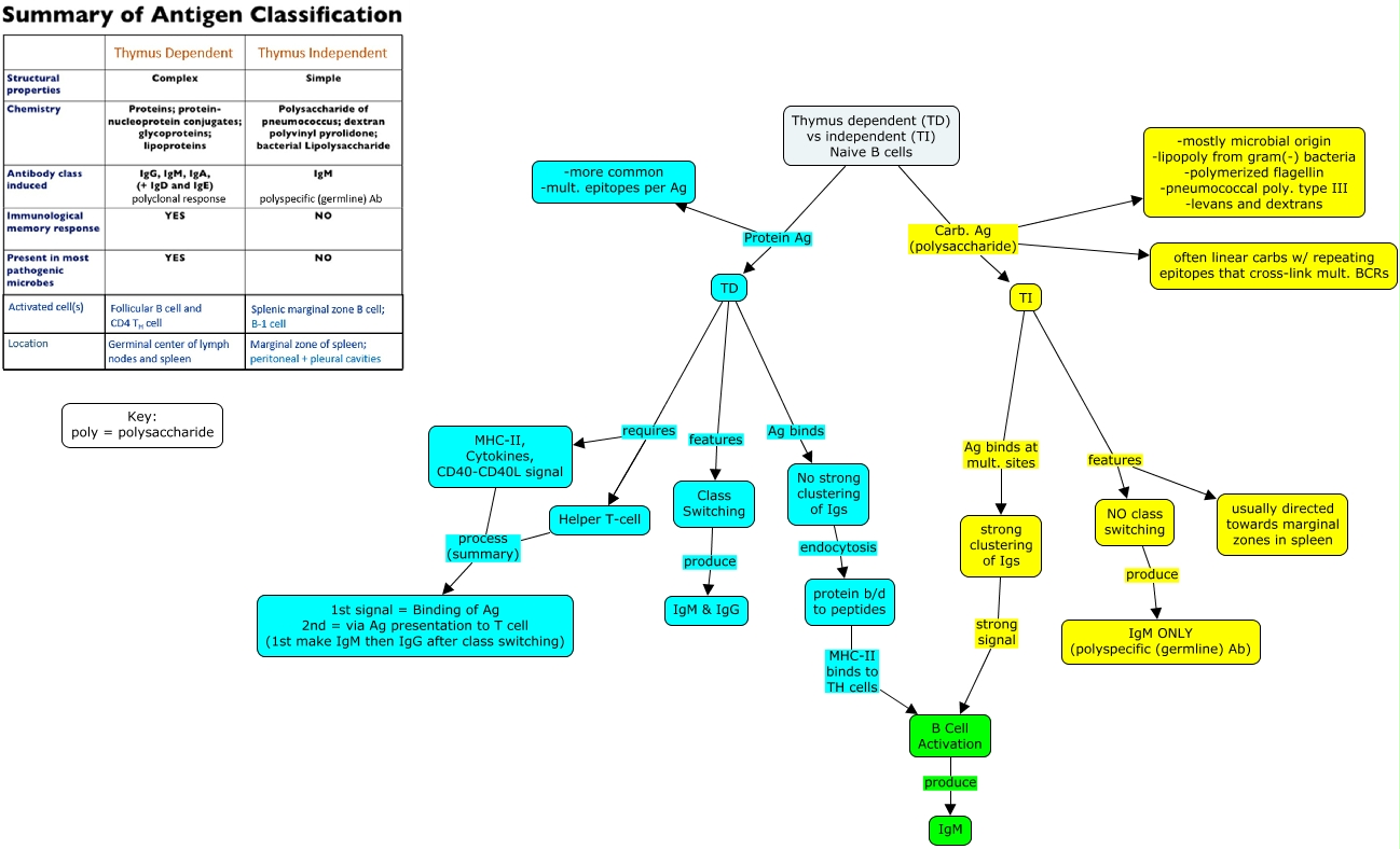 This Concept Map, created with IHMC CmapTools, has information related to: thymus dependent vs independent B cell activation, TD requires MHC-II, Cytokines, CD40-CD40L signal, TD features Class Switching, NO class switching produce IgM ONLY (polyspecific (germline) Ab), Thymus dependent (TD) vs independent (TI) Naive B cells Carb. Ag (polysaccharide) -mostly microbial origin -lipopoly from gram(-) bacteria -polymerized flagellin -pneumococcal poly. type III -levans and dextrans, Thymus dependent (TD) vs independent (TI) Naive B cells Carb. Ag (polysaccharide) TI, Thymus dependent (TD) vs independent (TI) Naive B cells Protein Ag TD, TD requires Helper T-cell, B Cell Activation produce IgM, Thymus dependent (TD) vs independent (TI) Naive B cells Protein Ag -more common -mult. epitopes per Ag, protein b/d to peptides MHC-II binds to TH cells B Cell Activation, TI features usually directed towards marginal zones in spleen, Thymus dependent (TD) vs independent (TI) Naive B cells Carb. Ag (polysaccharide) often linear carbs w/ repeating epitopes that cross-link mult. BCRs, MHC-II, Cytokines, CD40-CD40L signal process (summary) 1st signal = Binding of Ag 2nd = via Ag presentation to T cell (1st make IgM then IgG after class switching), No strong clustering of Igs endocytosis protein b/d to peptides, TI features NO class switching, Helper T-cell process (summary) 1st signal = Binding of Ag 2nd = via Ag presentation to T cell (1st make IgM then IgG after class switching), strong clustering of Igs strong signal B Cell Activation, TI Ag binds at mult. sites strong clustering of Igs, TD Ag binds No strong clustering of Igs, TD requires Helper T-cell