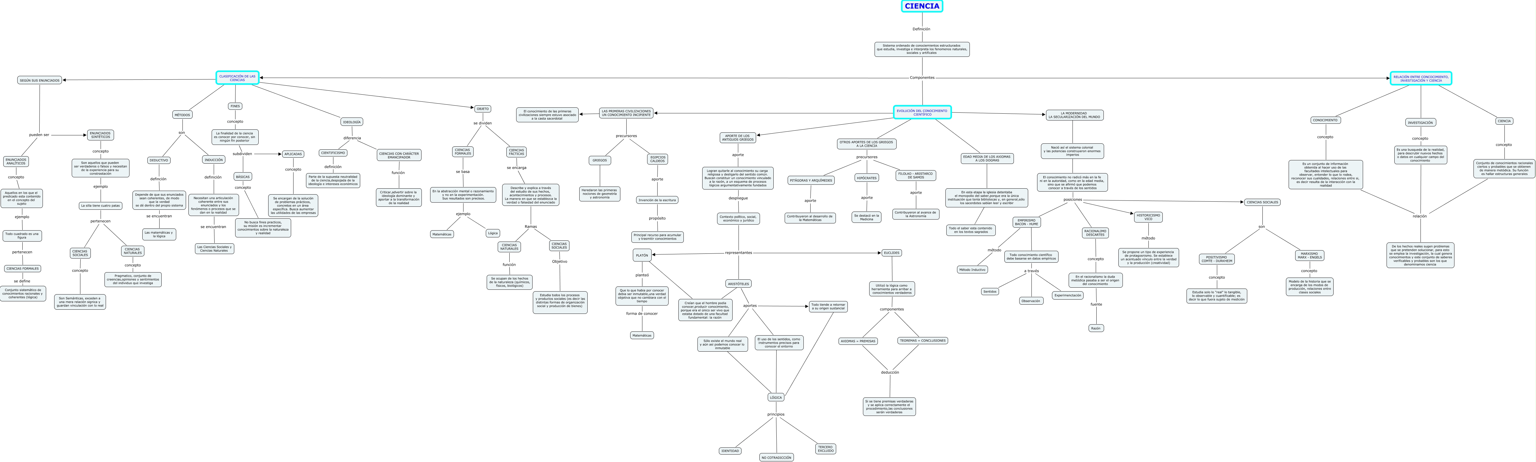 Este Cmap, tiene información relacionada con: CIENCIA 123, SEGÚN SUS ENUNCIADOS pueden ser ENUNCIADOS SINTÉTICOS, MARXISMO MARX - ENGELS concepto Modelo de la historia que se encarga de los modos de producción, relaciones entre clases sociales, LAS PRIMERAS CIVILIZACIONES UN CONOCIMIENTO INCIPIENTE precursores GRIEGOS, El uso de los sentidos, como instrumentos precisos para conocer el entorno ???? LÓGICA, CLASIFICACIÓN DE LAS CIENCIAS ???? IDEOLOGÍA, Todo conocimiento científico debe basarse en datos empíricos a través Sentidos, LAS PRIMERAS CIVILIZACIONES UN CONOCIMIENTO INCIPIENTE ???? El conocimiento de las primeras civilizaciones siempre estuvo asociado a la casta sacerdotal, Utilizó la lógica como herramienta para arribar a conocimientos verdaderos componentes AXIOMAS = PREMISAS, IDEOLOGÍA diferencia CIENCIAS CON CARÁCTER EMANCIPADOR, CLASIFICACIÓN DE LAS CIENCIAS ???? SEGÚN SUS ENUNCIADOS, Que lo que habia por conocer debia ser inmutable,una verdad objetiva que no cambiara con el tiempo forma de conocer Matemáticas, Utilizó la lógica como herramienta para arribar a conocimientos verdaderos componentes TEOREMAS = CONCLUSIONES, EMPIRISMO BACON - HUME método Método Inductivo, LÓGICA principios TERCERO EXCLUIDO, El conocimiento no radicó más en la fe ni en la autoridad, como en la edad media, sino que se afirmó que podemos conocer a través de los sentidos posiciones CIENCIAS SOCIALES, CIENCIAS FORMALES se basa En la abstracción mental o razonamiento y no en la experimentación. Sus resultados son precisos., ENUNCIADOS SINTÉTICOS concepto Son aquellos que pueden ser verdaderos o falsos y necesitan de la experiencia para su constrastación, Todo conocimiento científico debe basarse en datos empíricos a través Observación, OTROS APORTES DE LOS GRIEGOS A LA CIENCIA precursores FILOLAO - ARISTARCO DE SAMOS, OBJETO se dividen CIENCIAS FORMALES