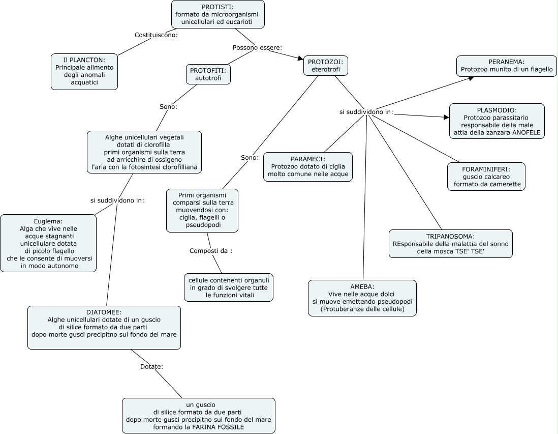 Questa Cmap, creata con IHMC CmapTools, contiene informazioni relative a: mappa protisti, PROTOZOI: eterotrofi Sono: Primi organismi comparsi sulla terra muovendosi con: ciglia, flagelli o pseudopodi, PROTISTI: formato da microorganismi unicellulari ed eucarioti Possono essere: PROTOZOI: eterotrofi, PROTOZOI: eterotrofi si suddividono in: PERANEMA: Protozoo munito di un flagello, DIATOMEE: Alghe unicellulari dotate di un guscio di silice formato da due parti dopo morte gusci precipitno sul fondo del mare Dotate: un guscio di silice formato da due parti dopo morte gusci precipitno sul fondo del mare formando la FARINA FOSSILE, PROTOFITI: autotrofi Sono: Alghe unicellulari vegetali dotati di clorofilla primi organismi sulla terra ad arricchire di ossigeno l'aria con la fotosintesi clorofilliana, PROTISTI: formato da microorganismi unicellulari ed eucarioti Possono essere: PROTOFITI: autotrofi, Primi organismi comparsi sulla terra muovendosi con: ciglia, flagelli o pseudopodi Composti da : cellule contenenti organuli in grado di svolgere tutte le funzioni vitali, PROTISTI: formato da microorganismi unicellulari ed eucarioti Costituiscono: Il PLANCTON: Principale alimento degli anomali acquatici, PROTOZOI: eterotrofi si suddividono in: FORAMINIFERI: guscio calcareo formato da camerette, PROTOZOI: eterotrofi si suddividono in: TRIPANOSOMA: REsponsabile della malattia del sonno della mosca TSE' TSE', PROTOZOI: eterotrofi si suddividono in: AMEBA: Vive nelle acque dolci si muove emettendo pseudopodi (Protuberanze delle cellule), PROTOZOI: eterotrofi si suddividono in: PLASMODIO: Protozoo parassitario responsabile della male attia della zanzara ANOFELE, Alghe unicellulari vegetali dotati di clorofilla primi organismi sulla terra ad arricchire di ossigeno l'aria con la fotosintesi clorofilliana si suddividono in: Euglema: Alga che vive nelle acque stagnanti unicellulare dotata di picolo flagello che le consente di muoversi in modo autonomo, PROTOZOI: eterotrofi si suddividono in: PARAMECI: Protozoo dotato di ciglia molto comune nelle acque, Alghe unicellulari vegetali dotati di clorofilla primi organismi sulla terra ad arricchire di ossigeno l'aria con la fotosintesi clorofilliana si suddividono in: DIATOMEE: Alghe unicellulari dotate di un guscio di silice formato da due parti dopo morte gusci precipitno sul fondo del mare