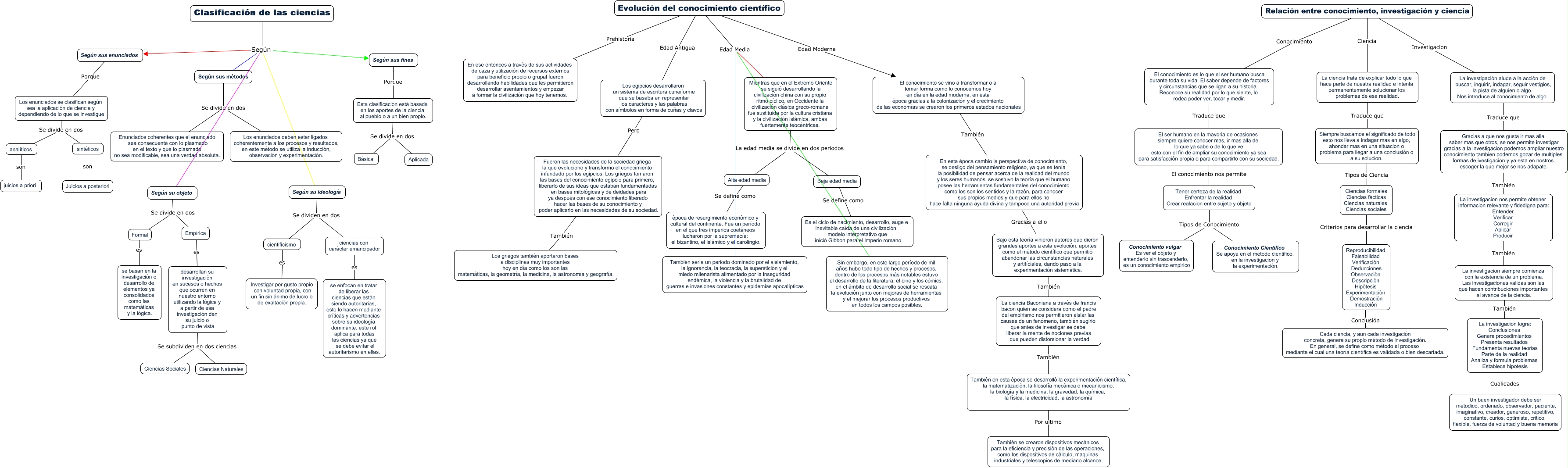 Este Cmap, tiene información relacionada con: Mapa Conceptual F_y_G_I, El conocimiento se vino a transformar o a tomar forma como lo conocemos hoy en día en la edad moderna, en esta época gracias a la colonización y el crecimiento de las economías se crearon los primeros estados nacionales También En esta época cambio la perspectiva de conocimiento, se desligo del pensamiento religioso, ya que se tenía la posibilidad de pensar acerca de la realidad del mundo y los seres humanos; se sostuvo la teoría que el humano posee las herramientas fundamentales del conocimiento como los son los sentidos y la razón, para conocer sus propios medios y que para ellos no hace falta ninguna ayuda divina y tampoco una autoridad previa, Gracias a que nos gusta ir mas alla saber mas que otros, se nos permite investigar gracias a la investigacion podemos ampliar nuestro conocimiento tambien podemos gozar de multiples formas de ivestigacion y ya esta en nostros escoger la que mejor se nos adapate. También La investigacion nos permite obtener informacion relevante y fidedigna para: Entender Verificar Corregir Aplicar Producir, Según sus fines Porque Esta clasificación está basada en los aportes de la ciencia al pueblo o a un bien propio., Clasificación de las ciencias Según Según su objeto, Reproducibilidad Falsabilidad Verificación Deducciones Observación Descripción Hipótesis Experimentación Demostración Inducción Conclusión Cada ciencia, y aun cada investigación concreta, genera su propio método de investigación. En general, se define como método el proceso mediante el cual una teoría científica es validada o bien descartada., Los egipcios desarrollaron un sistema de escritura cuneiforme que se basaba en representar los caracteres y las palabras con símbolos en forma de cuñas y clavos Pero Fueron las necesidades de la sociedad griega la que evoluciono y transformo el conocimiento infundado por los egipcios. Los griegos tomaron las bases del conocimiento egipcio para primero, liberarlo de sus ideas que estaban fundamentadas en bases mitológicas y de deidades para ya después con ese conocimiento liberado hacer las bases de su conocimiento y poder aplicarlo en las necesidades de su sociedad., Esta clasificación está basada en los aportes de la ciencia al pueblo o a un bien propio. Se divide en dos Aplicada, Según su ideología Se dividen en dos cientificismo, Los enunciados se clasifican según sea la aplicación de ciencia y dependiendo de lo que se investigue Se divide en dos analíticos, Clasificación de las ciencias Según Según sus enunciados, Según sus métodos Se divide en dos Enunciados coherentes que el enunciado sea consecuente con lo plasmado en el texto y que lo plasmado no sea modificable, sea una verdad absoluta., Evolución del conocimiento científico Prehistoria En ese entonces a través de sus actividades de caza y utilización de recursos externos para beneficio propio o grupal fueron desarrollando habilidades que les permitieron desarrollar asentamientos y empezar a formar la civilización que hoy tenemos., También en esta época se desarrolló la experimentación científica, la matematización, la filosofía mecánica o mecanicismo, la biología y la medicina, la gravedad, la química, la física, la electricidad, la astronomía Por ultimo También se crearon dispositivos mecánicos para la eficiencia y precisión de las operaciones, como los dispositivos de cálculo, maquinas industriales y telescopios de mediano alcance., Relación entre conocimiento, investigación y ciencia Ciencia La ciencia trata de explicar todo lo que hace parte de nuestra realidad e intenta permanentemente solucionar los problemas de esa realidad., sintéticos son Juicios a posteriori, La investigacion logra: Conclusiones Genera procedimientos Presenta resultados Fundamenta nuevas teorias Parte de la realidad Analiza y formula problemas Establece hipotesis Cualidades Un buen investigador debe ser metodico, ordenado, observador, paciente, imaginativo, creador, generoso, repetitivo, constante, curios, optimista, critico, flexible, fuerza de voluntad y buena memoria, El conocimiento es lo que el ser humano busca durante toda su vida. El saber depende de factores y circunstancias que se ligan a su historia. Reconoce su realidad por lo que siente, lo rodea poder ver, tocar y medir. Traduce que El ser humano en la mayoria de ocasiones siempre quiere conocer mas, ir mas alla de lo que ya sabe o de lo que ve esto con el fin de ampliar su conocimiento ya sea para satisfacción propia o para compartirlo con su sociedad., Formal es se basan en la investigación o desarrollo de elementos ya consolidados como las matemáticas y la lógica., Según su ideología Se dividen en dos ciencias con carácter emancipador, Relación entre conocimiento, investigación y ciencia Conocimiento El conocimiento es lo que el ser humano busca durante toda su vida. El saber depende de factores y circunstancias que se ligan a su historia. Reconoce su realidad por lo que siente, lo rodea poder ver, tocar y medir.